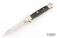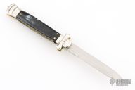 This lockback Auto by AGA Campolin has a stainless steel dagger blade with false top edge. Handle has horn covers with nickel silver bolsters, brass liners, stainless steel backspacer. Has a couple light scratches, otherwise Excellent condition.