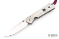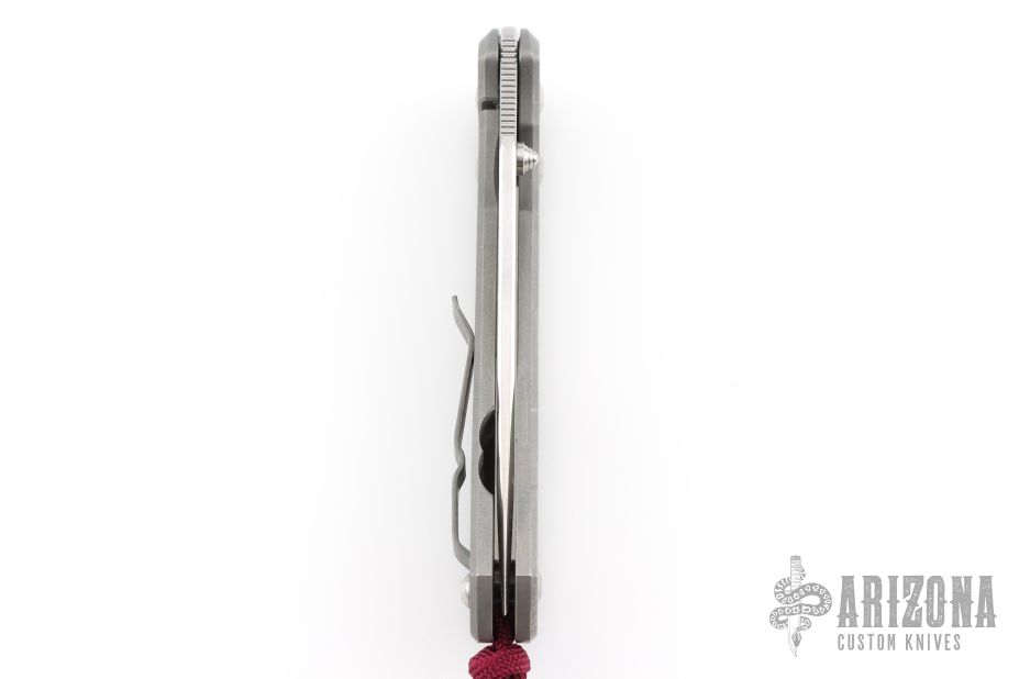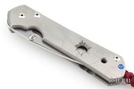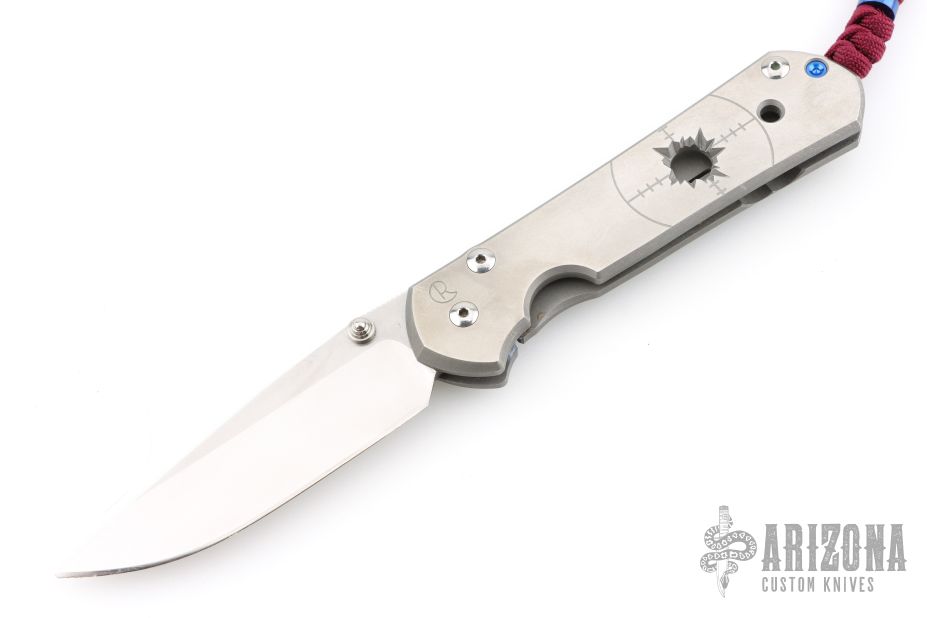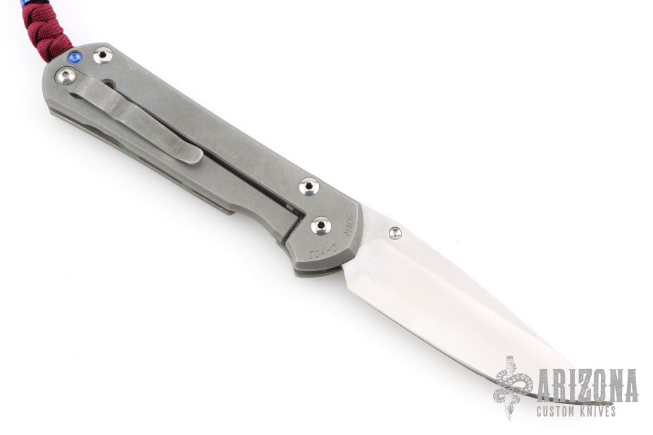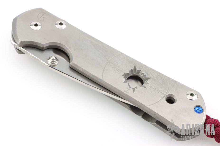 This large Sebenza 21 by Chris Reeve Knives features a two tone blade with satin grinds and stonewashed flats, notched thumbrest and single thumbstud. The handle is bead blasted titanium with satin finished front and the ".50 Cal" graphic on the front scale, tip up clip. Comes with original box, sheath and COA dated December 16, 2014. Has scuffs and scratches, has been used and carried, has dings in the blade edge, good user condition.