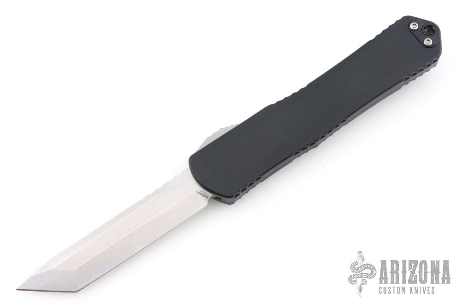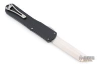 This model of the Manticore-X comes equipped with a stonewash finished tanto blade and a black anodized aluminum handle. The Heretic Knives Manticore-X is a full size Out-the-Front knife with a clean and functional aesthetic. It features a contoured aluminum chassis with jimping all along the sides. This lightweight and capable OTF knife opens and closes smoothly, making for an excellent every day or tactical carry. Comes with a ball-bearing glass breaker and a deep carry pocket clip. Comes with original box and lube. #03539. Has a few scuffs, otherwise excellent condition.