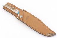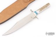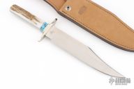 This Bowie by Buck Knives features a satin finished clip point blade with .176" blade stock and 1.419" blade depth, full tang construction. The handle is comprised of a nickel silver guard, blue/silver spacers, and elk antler covers. Includes a brown leather sheath with belt loop, original box and papers. Excellent condition.