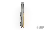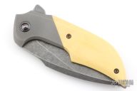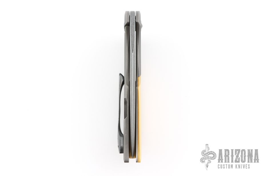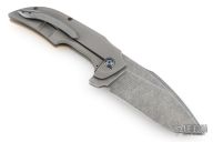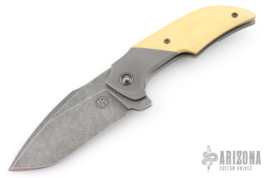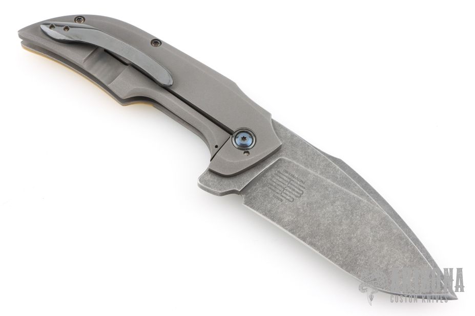 This knife by Tuff Knives is a Tashi Bharucha design, it features a dark stonewashed blade with flipper. The handle has a bead blasted titanium frame with zirconium pivot collars, ivory paper micarta scale and backspacer, tip up zirconium clip. Nice detent, lockup and blade seating. Rides on bearings. Has a few light scuffs and scratches, otherwise excellent condition. Comes with a hard case.