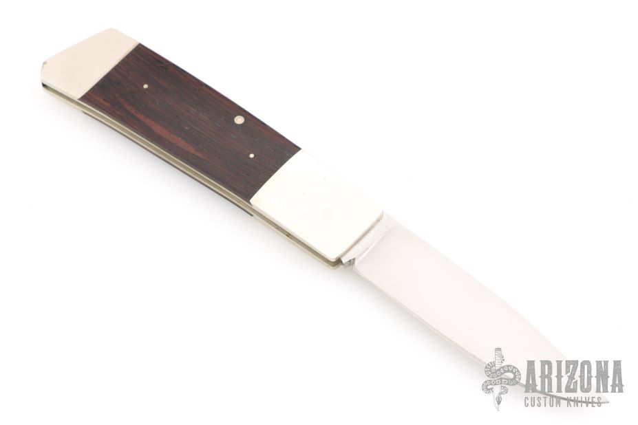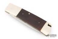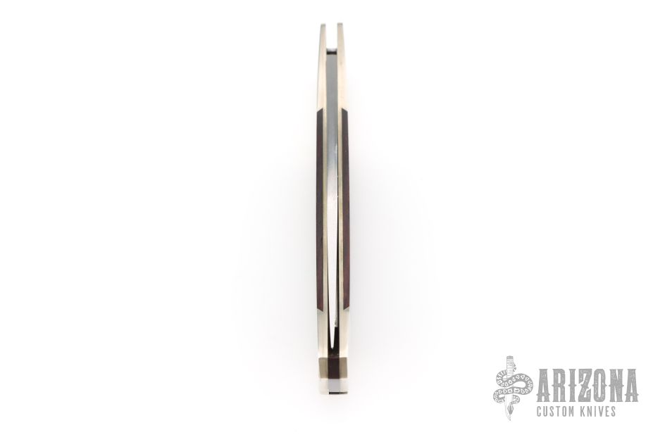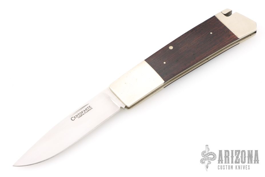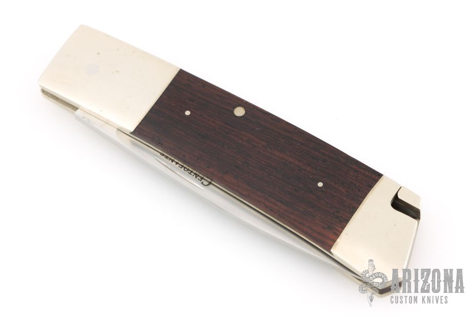 This Side lock by Frank Centofante features a hand rub satin finished blade with nail nick. The handle has dovetailed nickel silver boslters, wood scales, nickel silver liners and a stainless steel backspacer. Nice lockup and blade seating. Has a couple light scratches, otherwise excellent condition.