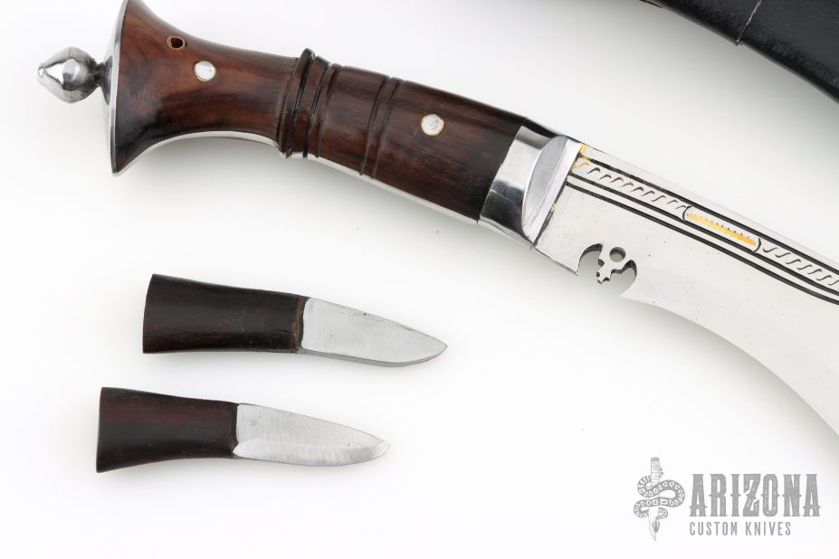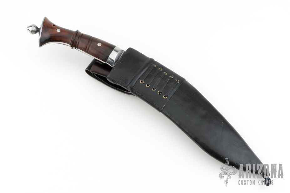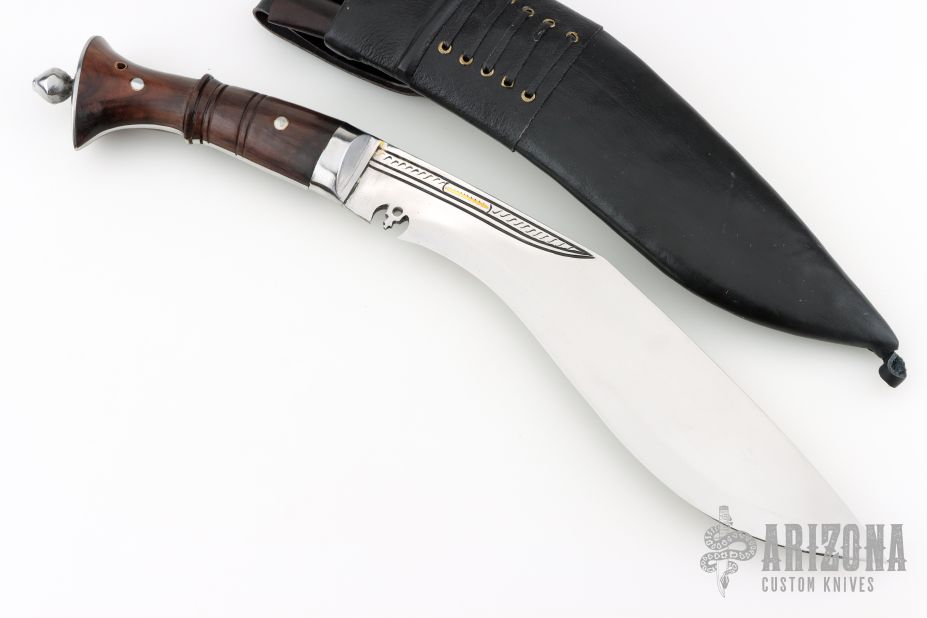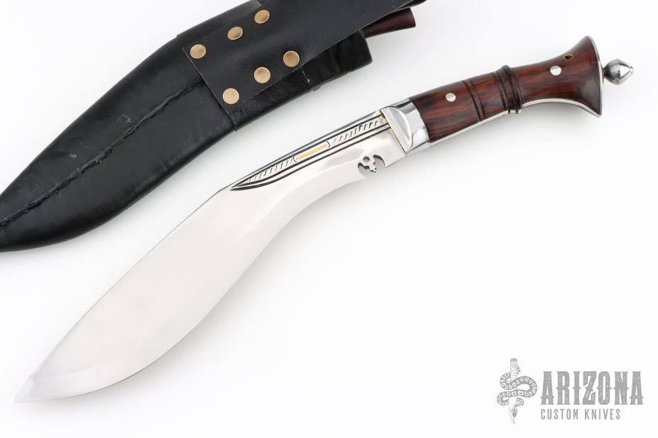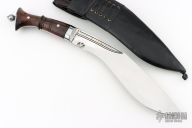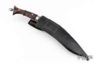 This Kukri has a satin/polish finished blade with carving and inlaid brass, .333" blade stock and 2.1" blade depth, hidden tang construction. Handle has a steel bolster and butt plate, rosewood grip. Comes with a brown leather sheath. Excellent condition.
