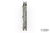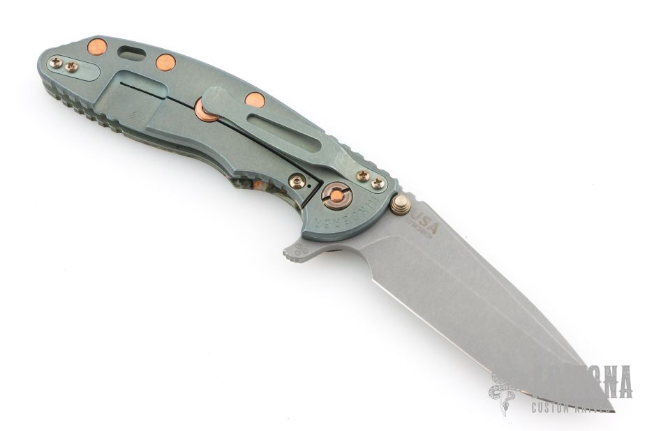 This XM-18 Spanto by Rick Hinderer Knives features a 3.5" special battle finished blade, notched thumbrest and dual thumbstuds. The handle has a wood/resin scale, and anodized/distressed finished frame, and matching Clip can be mounted for tip up or down carry. Tri-way pivot system. Copper hardware and Ti studs. Nice lockup, and detent. Includes the original box, extra washers, and card. Excellent condition.