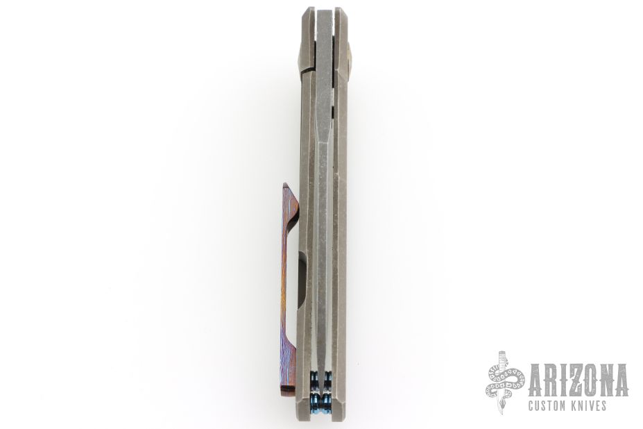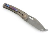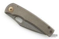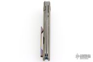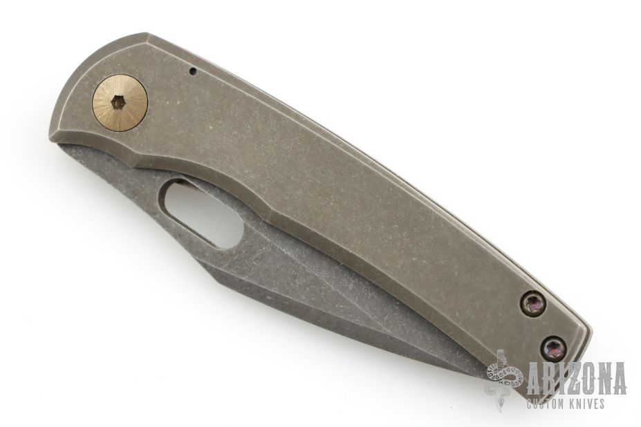 This BBM by Robert Carter features a stonewashed blade with thumbhole. The handle has a a tumbled titanium frame, bronzed pivot, anodized titanium barrel spacers, and tip up MokuTi clip. Nice detent, lockup and blade seating. Excellent condition.