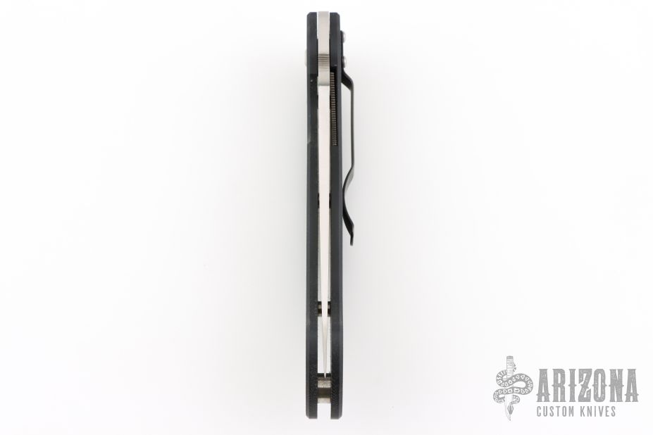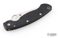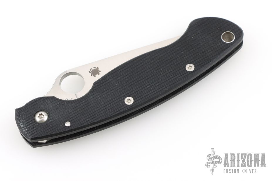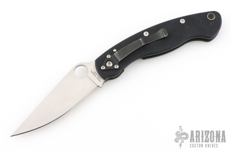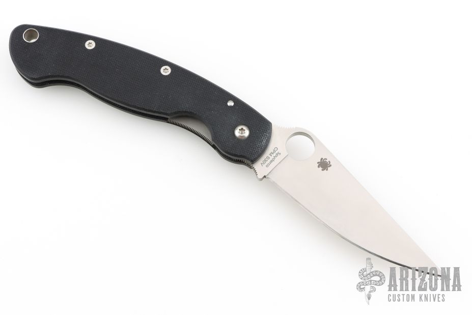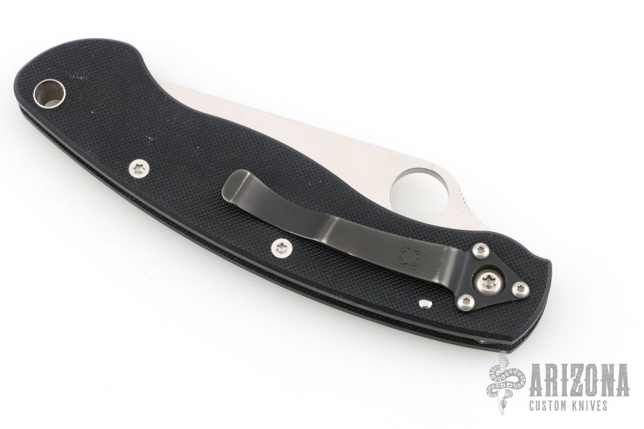 This Military Lefty by Spyderco has a satin finished CPM S30V stainless steel clip point blade with notched thumb rest and thumb hole. Handle is black G10, with stainless steel single liner (lock), black fiber back spacer, black stainless steel tip down clip, and lanyard tube pin. LEFT HANDED MODEL. DISCONTINUED. Has some light scuffs/scratches, otherwise great condition.