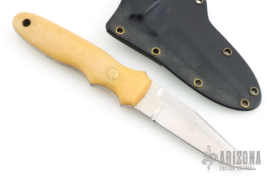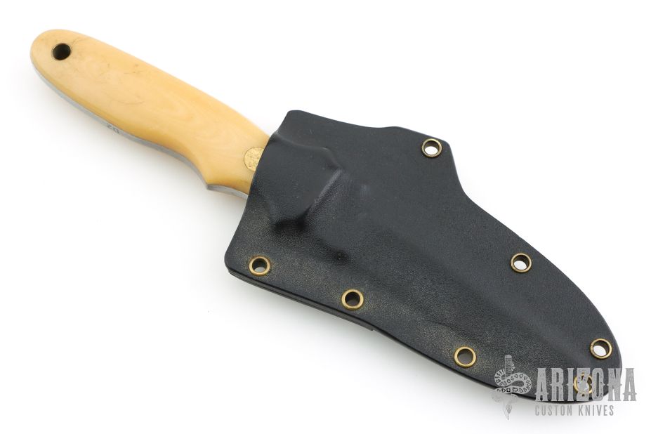 This KM-6 Arkansas Toothpick by Dozier knives features a satin finished blade with a sharpened top edge, .185" blade stock and .854" blade depth, full tang construction. The handle has micarta scales. Comes with kydex sheath with a broken belt loop. Has some light spotting on the blade and scratches otherwise good condition.  This knife would make a great user.