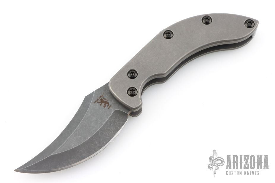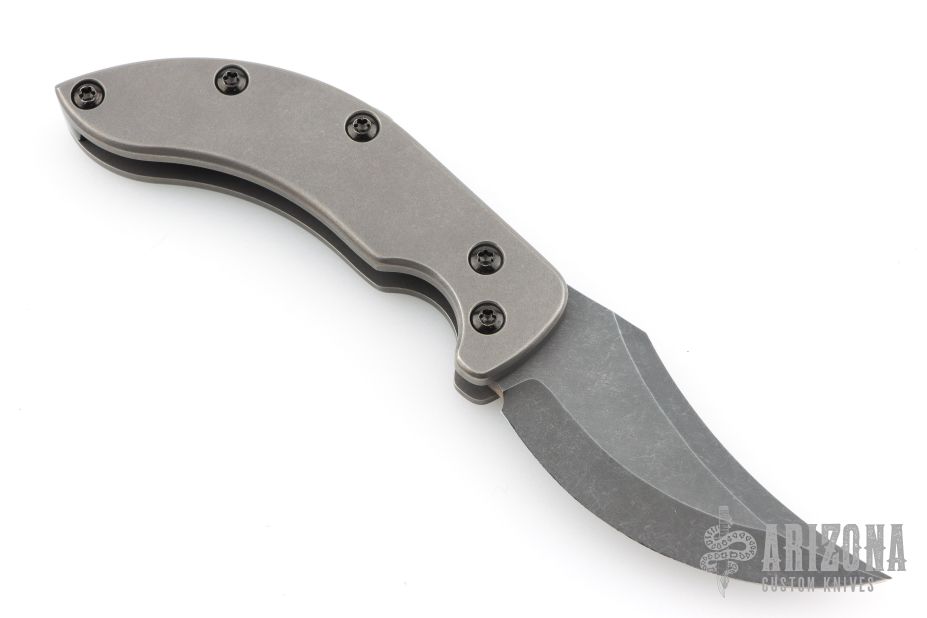 This Persian Friction Folder by Sam Eddleman features a stonewashed blade with false top edge and friction bar. The handle has a stonewashed titanium frame with a polished zirconium backspacer. Centered blade seating. Comes with a zippered case and COA dated 1/14/26. New from maker.