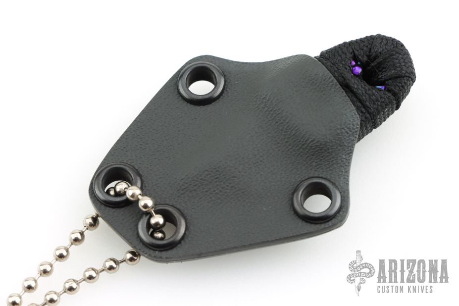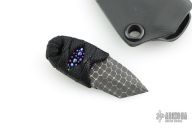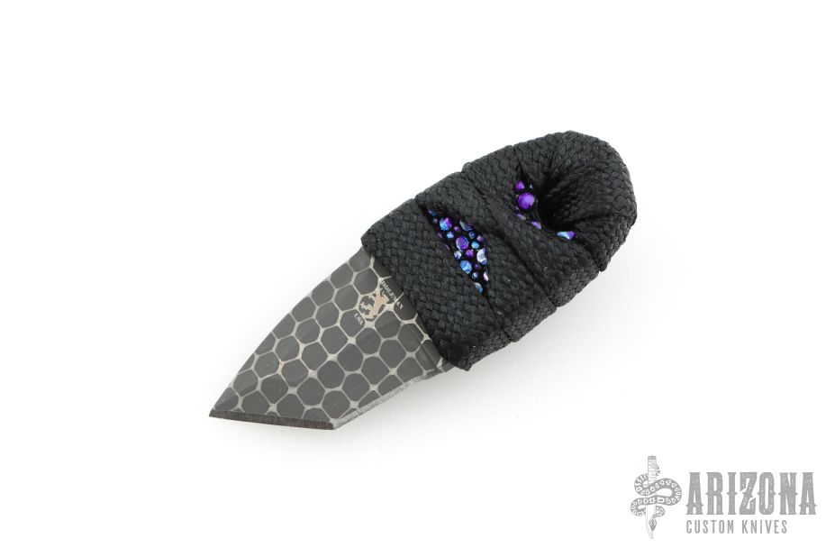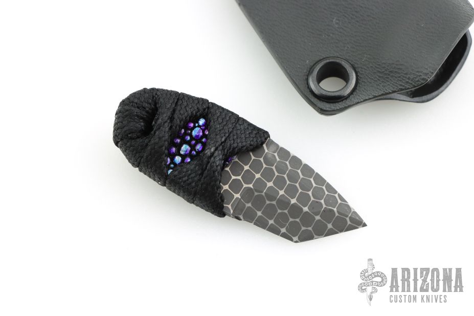 This Micro Shihan Tanto Necker by Sam Eddleman has a Stainless Honeycomb Pattern Damascus tanto blade with false top edge, .097" blade stock, .652" blade depth, hidden tang construction. The handle has epoxy soaked Japanese style wrap over holographic rainbow rayskin. Comes with a kydex neck sheath, zippered case and COA. New from maker.