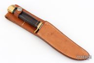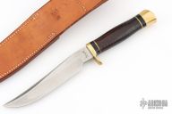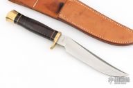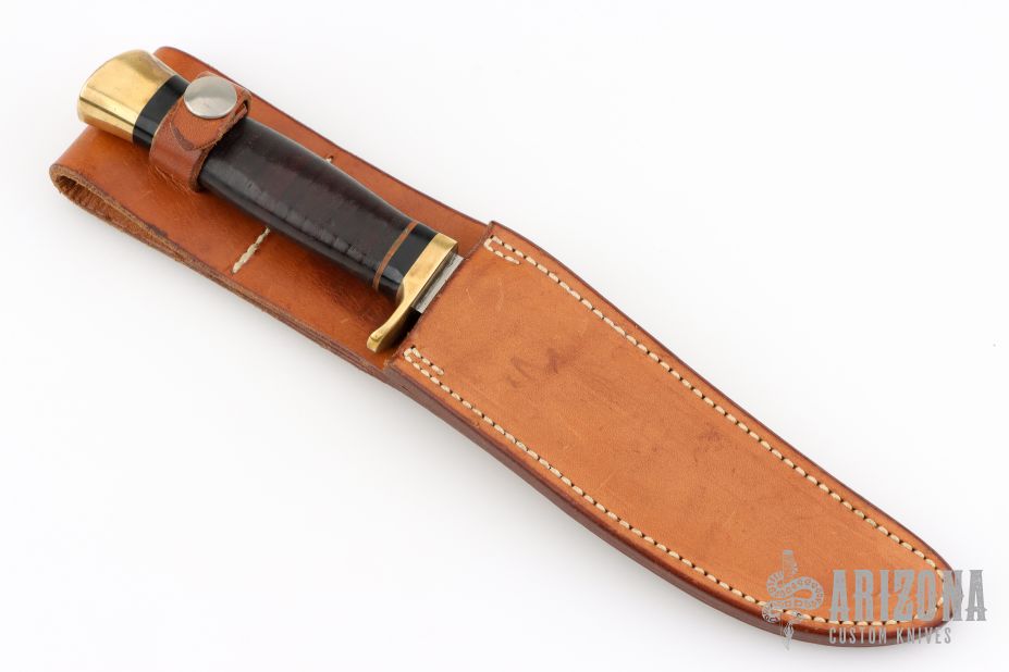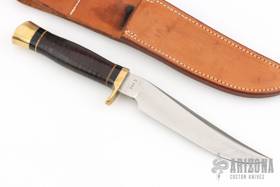 This Model C Hunter by GW Stone features a satin finished blade with a false top edge, .187" blade stock and 1.106" blade depth, hidden tang construction. The handle has a brass guard and butt cap, stacked leather grip with black/white spacers. Comes with a brown leather sheath. Has been used and sharpened, has scratches, good condition otherwise.