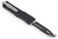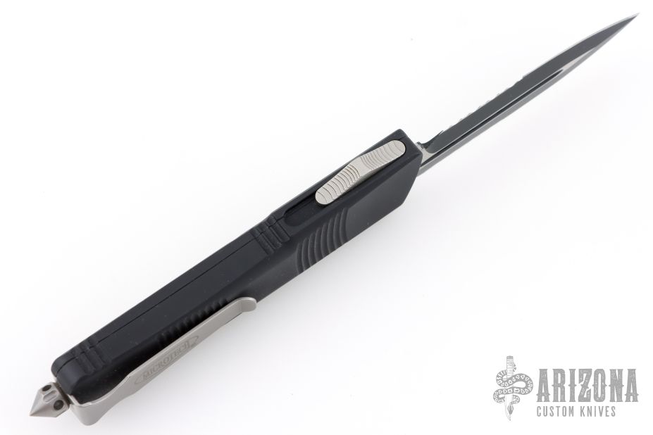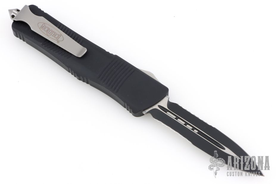 This Troodon by Microtech features a black double edge blade with partial serrations. The handle has a black aluminum frame with tip down clip. Dated 07/2013 and s/n 10442. Includes the original box, drawstring pouch, and papers. Excellent condition.