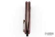 This Medusa by Heretic Knives features a bronzed tanto blade with false top edge, notched thumbrest. The handle has a red camo carbon cover, bronze button, black  backspacer and matching tip up titanium clip with ball. Comes with original box. #00525. Has some light scuffs and scratches, great overall condition.