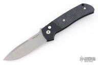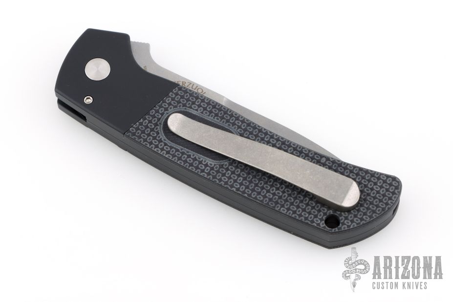 This ATCF Auto by Pro-Tech features a stonewashed Magnacut blade with notched thumbrest. The handle has a black aluminum frame with black G10 scales and a tip up milled titanium clip with hidden screws.  Pearl Push Button. Comes with original box, pouch, and papers. Excellent Condition.