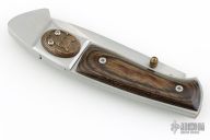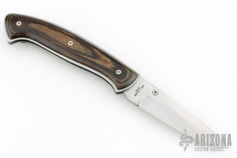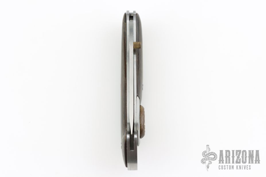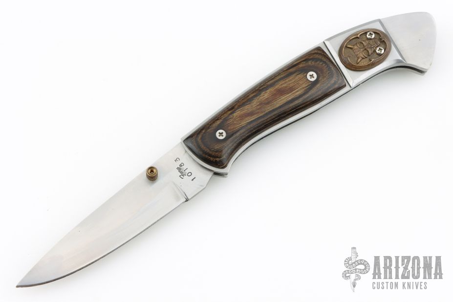 This lockback folder by Fury knives features a satin finished blade with single thumbstud. The handle has a satin finished stainless steel frame with wood scales. The lock release is the brass devil's head medallion, push it down to unlock. Has some light scratches and a couple small nicks in the blade, otherwise good condition.