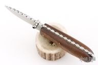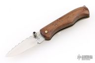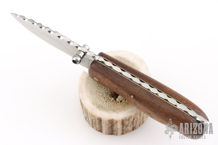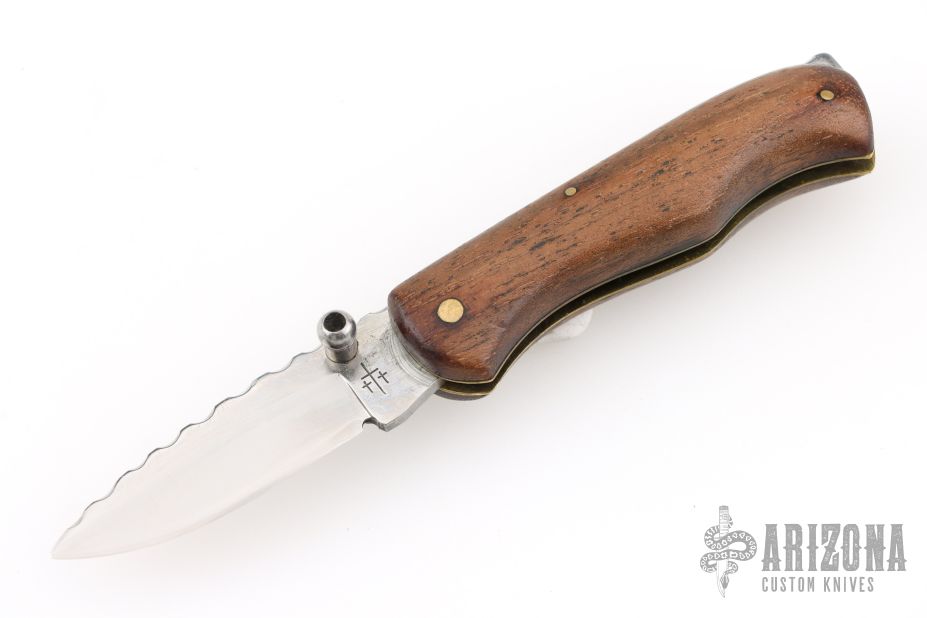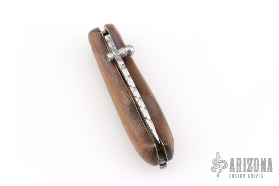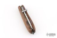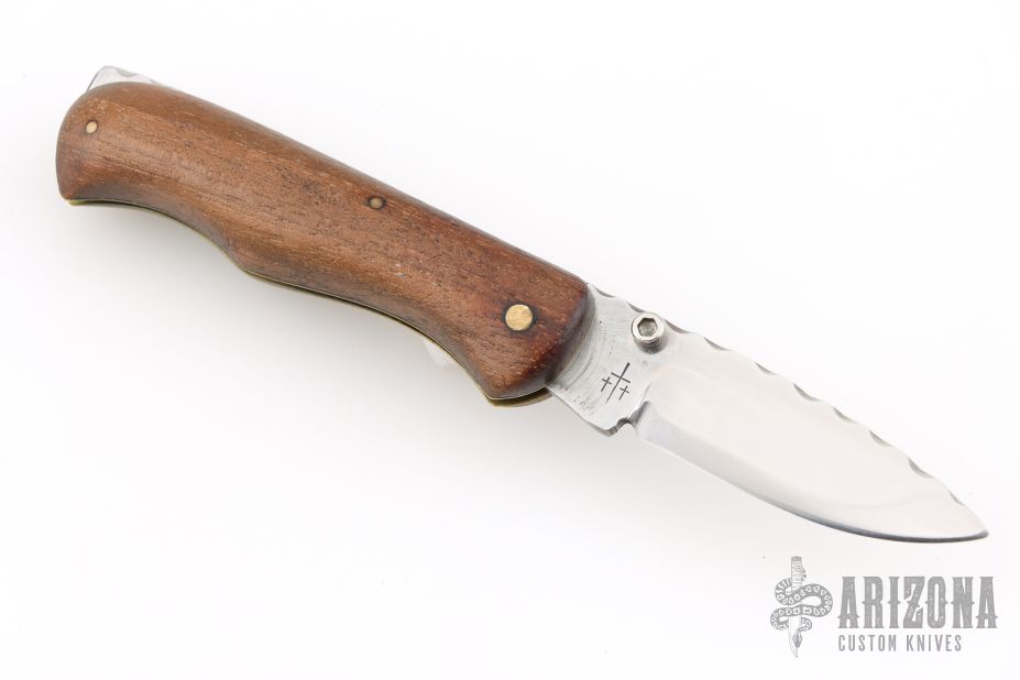 This Lockback by Center Cross Metal Works features a satin finished blade with dual thumbstuds and a fileworked spine. The handle has wood scales, brass liners with fileworked stainless steel backspacer. Has a few light scratches, otherwise excellent condition.