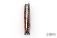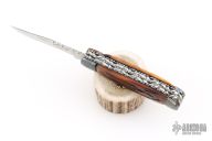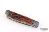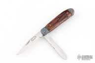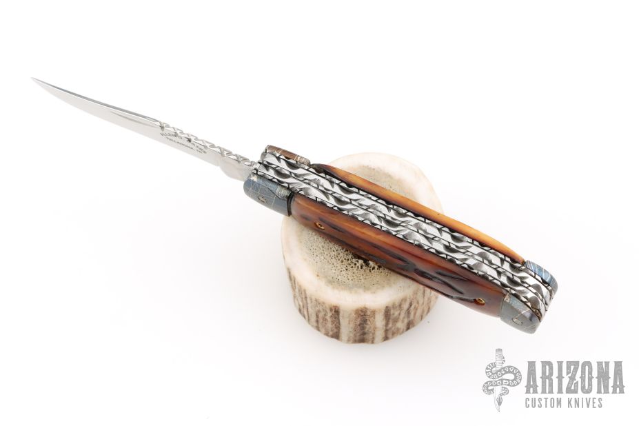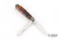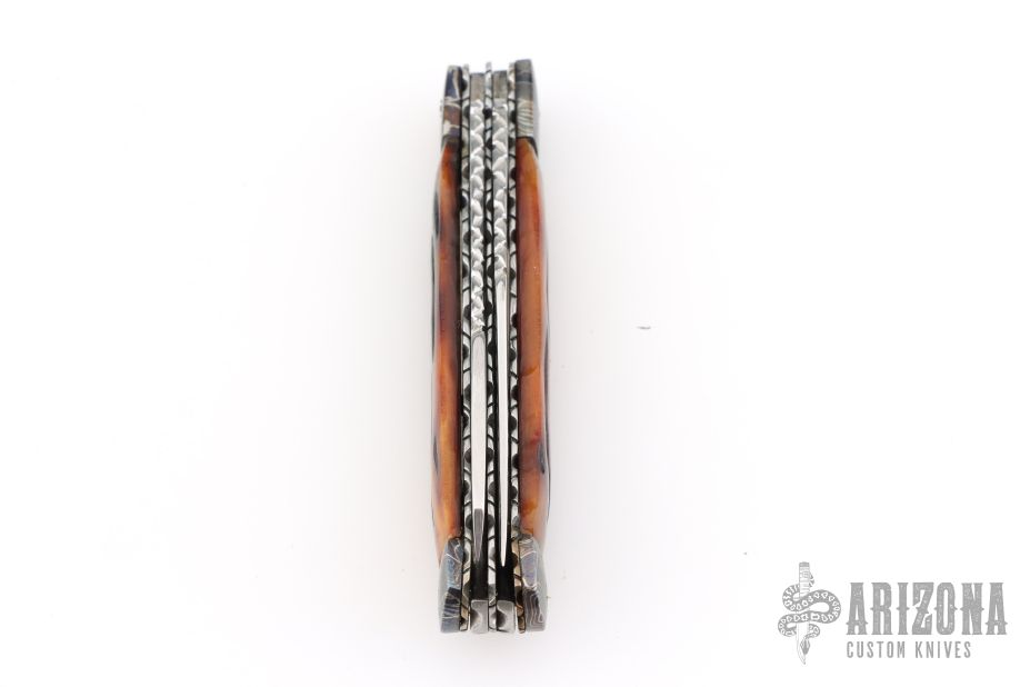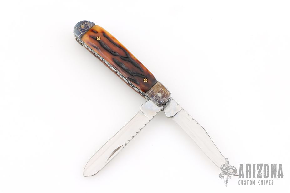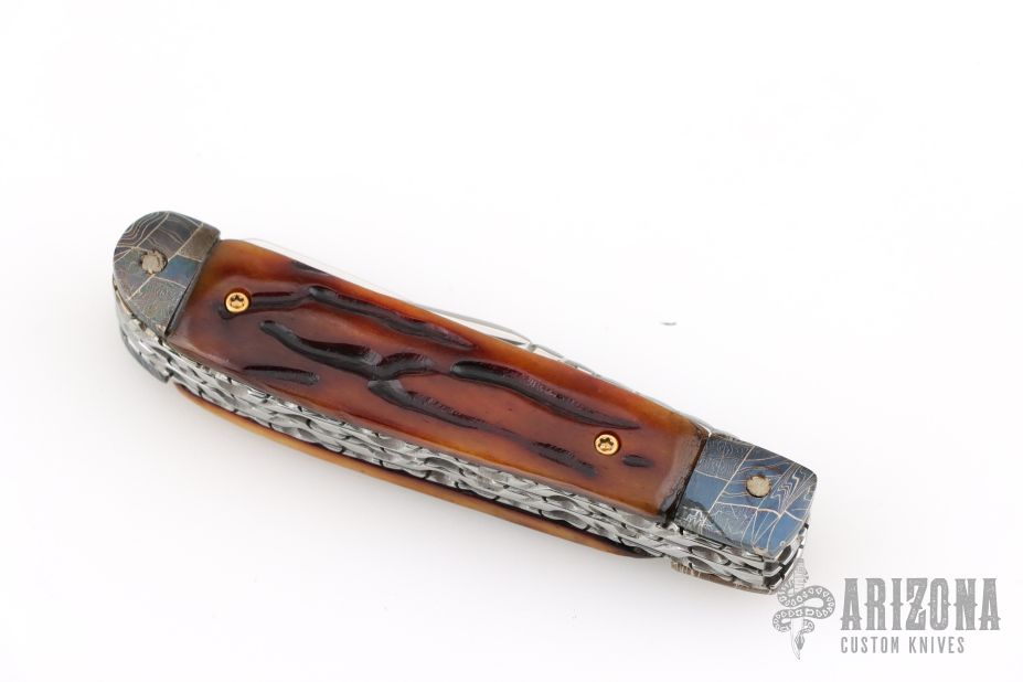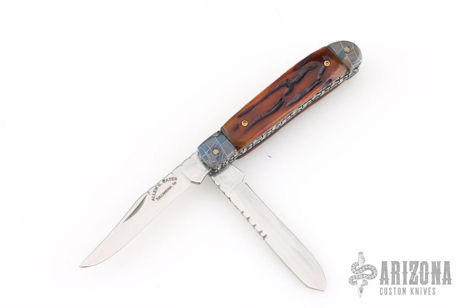 This slipjoint by Allen Cates features satin finished blades with nail nicks and fileworked spines. The handle has blued Mosaic Damascus bolsters, jigged bone covers, fileworked stainless steel liners, fileworked stainless steel springs. Has half-stops. Has some light scratches, otherwise good condition.