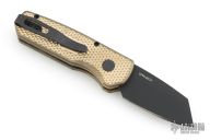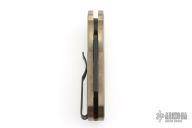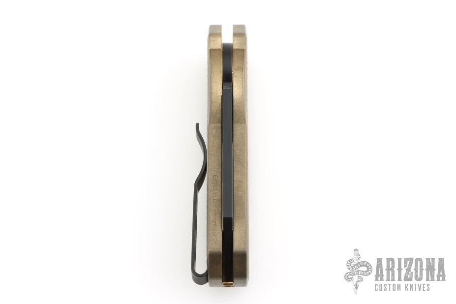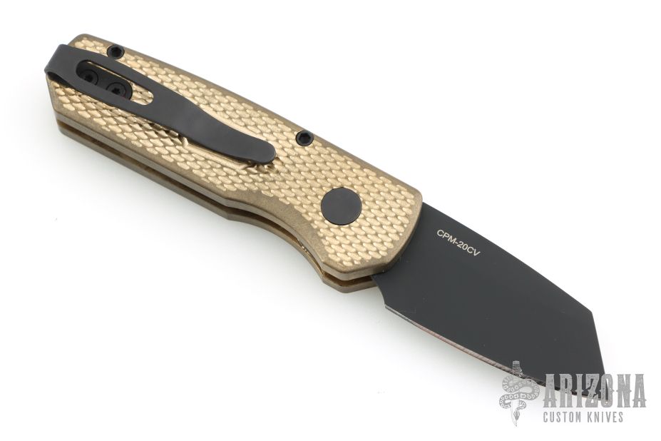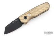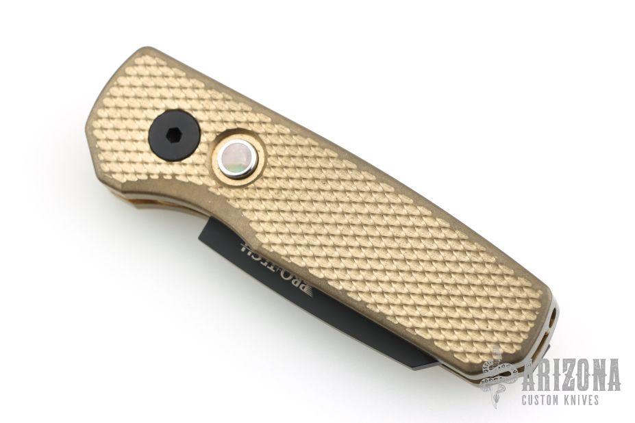 This Runt by Pro-Tech features a black wharncliffe blade.  The handle features a textured bronze aluminum frame with milled thumbrest, a black stainless steel tip up pocket clip and a mother-of-pearl push button. Comes with original box, pouch, and papers. Has some light scuffs, and patina. Excellent condition otherwise.