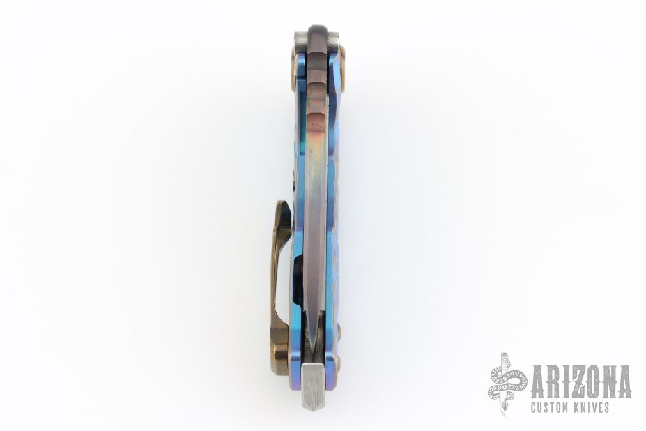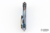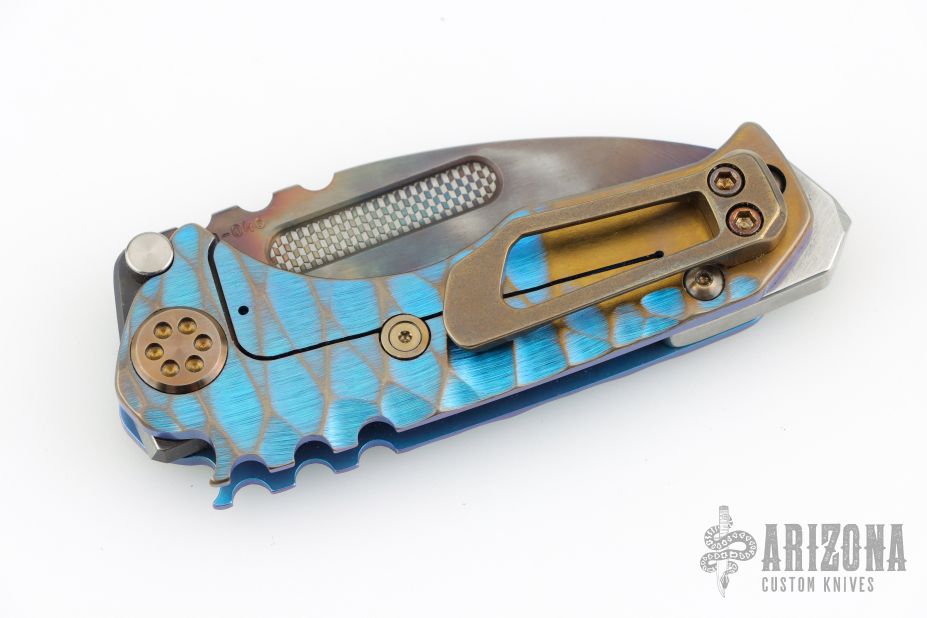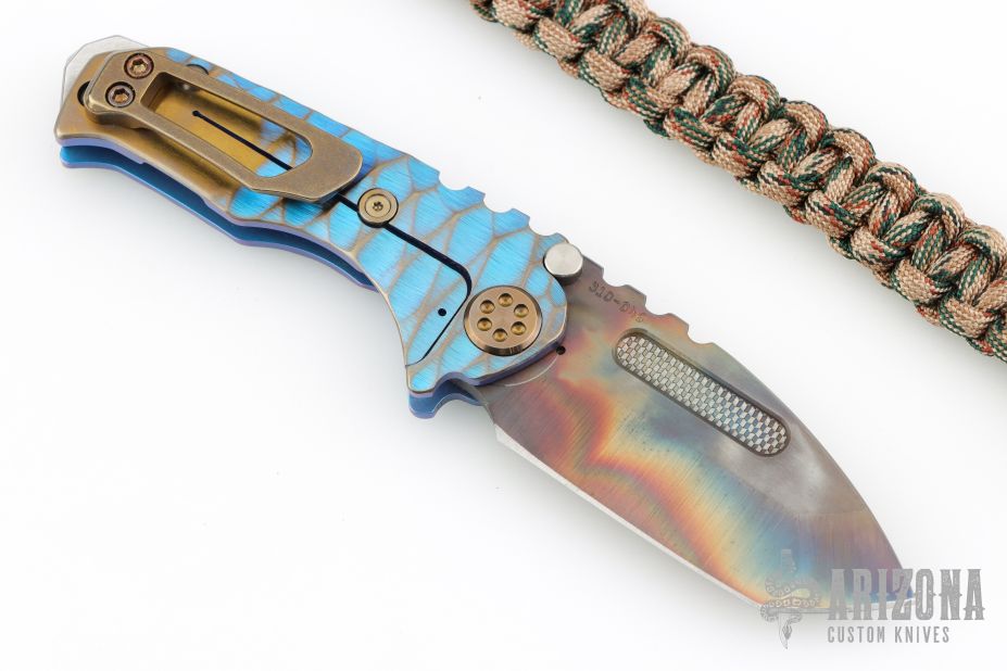 This Micro Praetorian T from Medford Knife and Tool features a Vulcan finished blade with notched thumbrest and checkered fullers. The handle has a carved and anodize finish titanium frame with a stainless steel backspacer doubles as a glass breaker, anodized titanium clip. Comes with original box, zippered case, and papers dated Feb 22, 2024. Excellent condition.