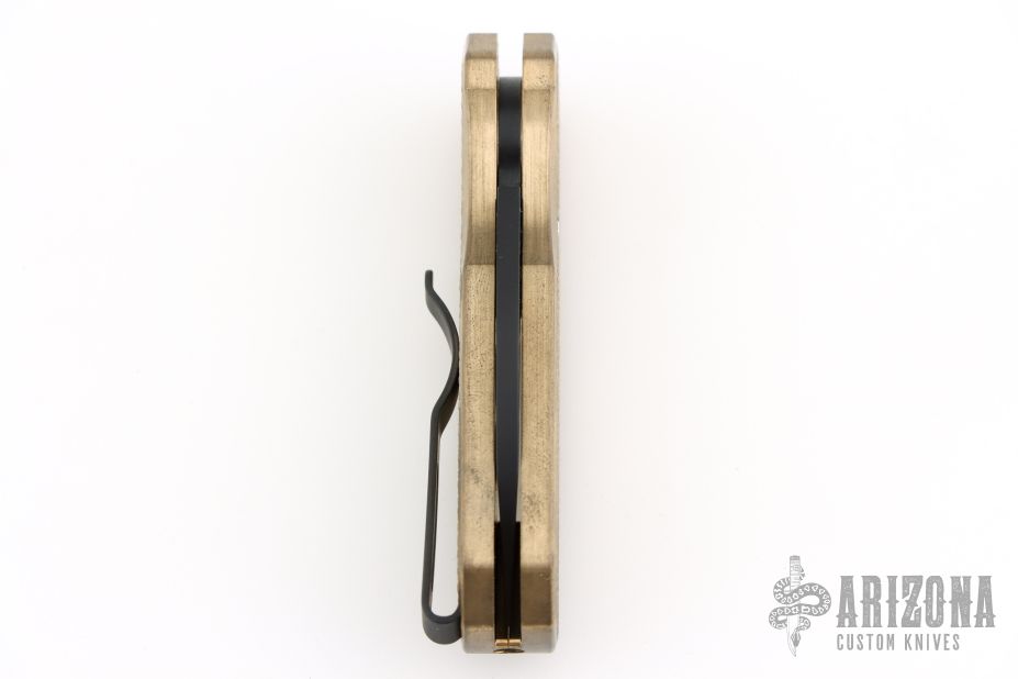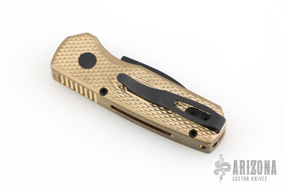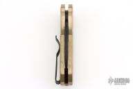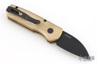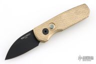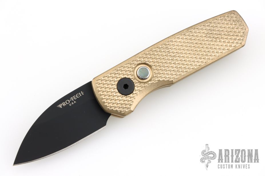 This Runt by Pro-Tech features a black 20cv blade.  The handle features a textured bronze aluminum frame with milled thumbrest, a stainless steel tip up pocket clip and a pearl push button.  Comes with Pro-Tech (R5306-SB) box, pouch, and papers. Has some light scuffs and patina. Excellent condition.