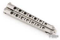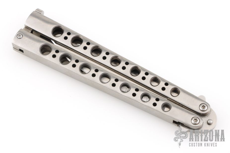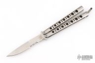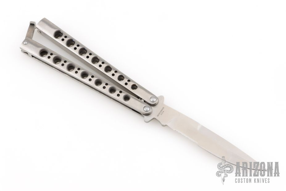 This Model 42S by Benchmade features a satin finished partially serrated blade. The handles are satin finished titanium with spring-latch. Comes with original nylon belt sheath. Excellent condition.