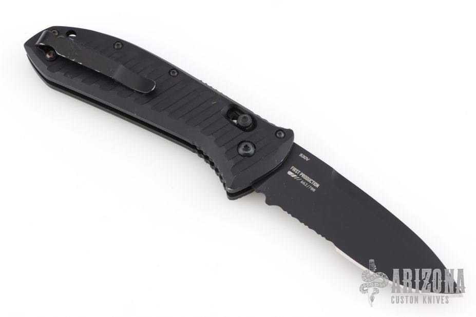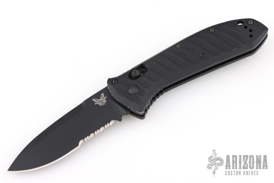 This automatic Presidio II model sports a black aluminum handle and a black finished blade with a partially serrated edge. Benchmade has updated their legendary Presidio model with significant ergonomic and performance upgrades. This combat legend has a black anodized 6061-T4 billet aluminum handle with Benchmade's AXIS lock system for effortless one-handed opening and closing. Milled grooves in the handle improve grip while adding a modern flair to the design. The Presidio II has a slightly larger blade and handle that is built to perform well as a tactical or everyday carry knife. Item includes a Cordura sheath with snap retention and a Malice Clip. 6061-T6 billet aluminum handle offers a tough build without weighing you down. Dual thumb studs, reversible pocket clip, and an AXIS® lock mechanism provide a fully ambidextrous design. Blade is made from CPM-S30V steel for maximized strength and cutting performance.