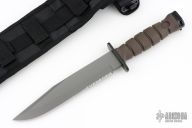 This combat knife features a grey coated blade with partially serrated edge, .189" blade stock and 1.422" blade depth, hidden tang construction. The handle has a black steel guard and butt with a rubber grip. Comes with original nylon sheath. Excellent condition.