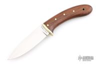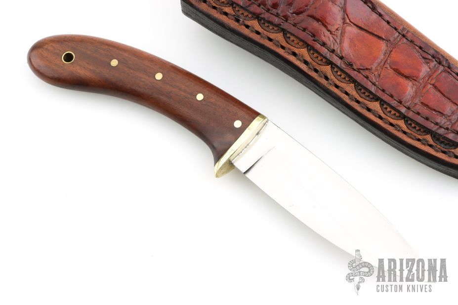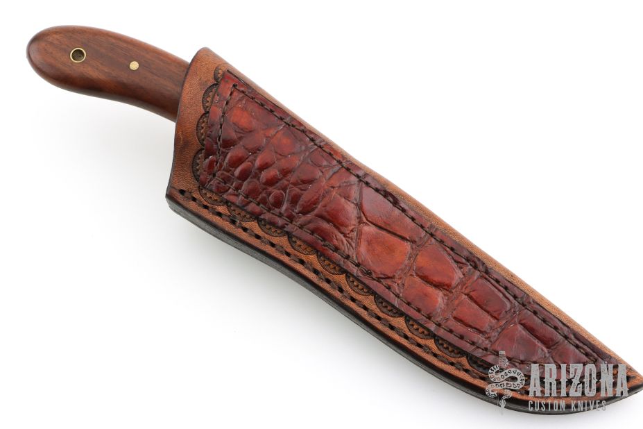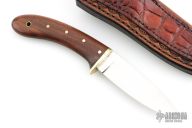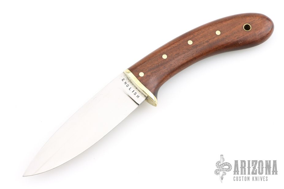 This knife by "English" (please let us know if you know this makers full name) features a satin polished blade with .126" blade stock and .998" blade depth, hidden tang construction. The handle has a brass guard and wood grip with brass pins and lanyard hole. Comes with a brown leather sheath with Alligator panel on the front. Has some light scratches, otherwise good condition.