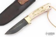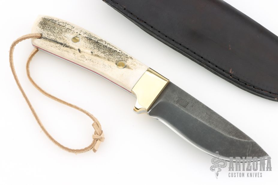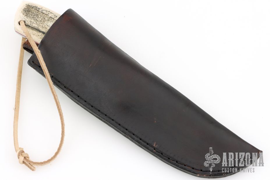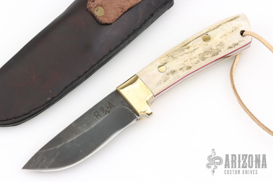 This knife by R&A Knives features a dark drop point blade with .161" blade stock and 1.180" blade depth, full tang construction. The handle has brass bolsters, stag scales with brass pins and red liners. Comes with a black leather sheath. Has a couple light scuffs, otherwise excellent condition.