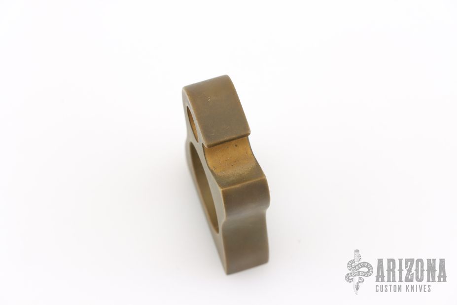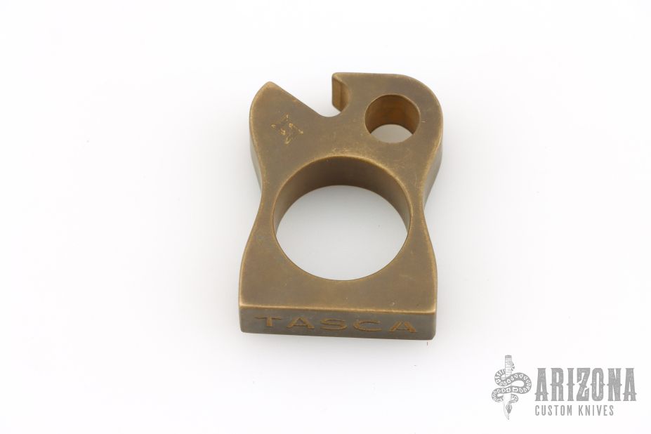 Brass Knuck Bottle Opener by Tasca Tools. Has a light patina, and some scuffs, excellent condition. Comes in a leather pouch. .48" thick, .983" diameter finger hole.