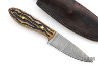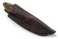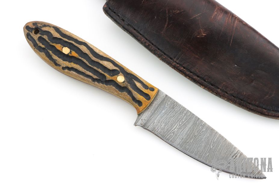 This knife by R&A Knives features a Damascus blade with .131" blade stock and 1.132" blade depth, full tang construction. The handle has jigged wood scales with brass pins and canvas micarta liners. Comes with a brown leather sheath. Has scratches, has been sharpened and used, otherwise good user condition.