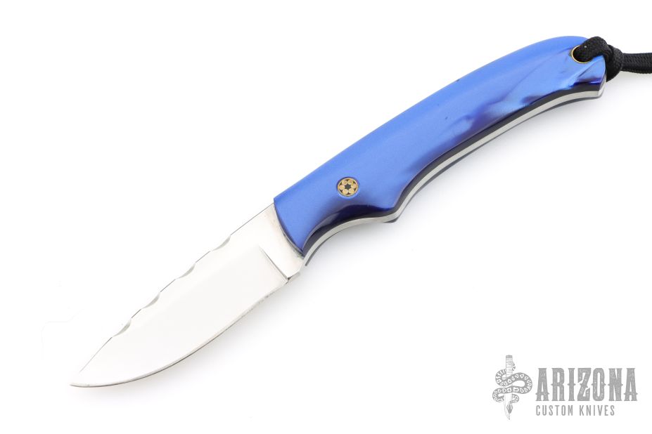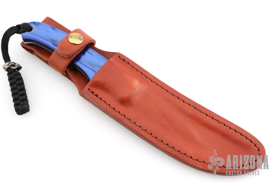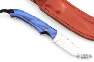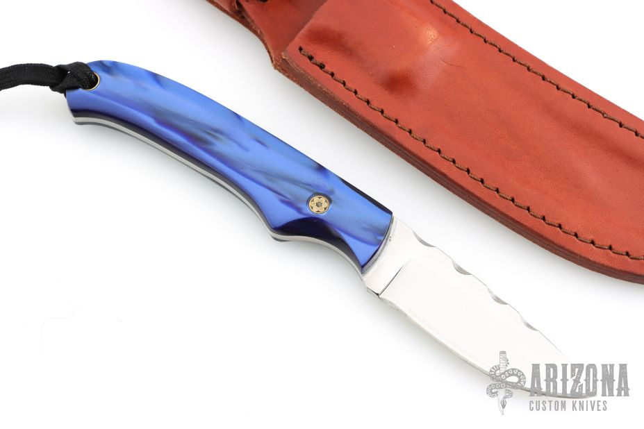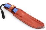 This knife by Vern's Knives features a mirror polished blade with fileworked spine, .119" blade stock and .862" blade depth, full tang construction. The handle has kirinite scales with mosaic pins. Comes with a brown leather sheath, not original but it fits. Has some light scratches, otherwise good condition.