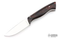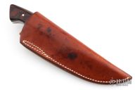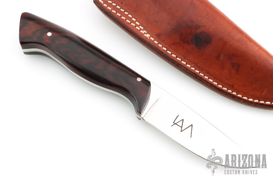 This knife by "LAM" (please let us know if you know who this is) features a mirror polished blade with .182" blade stock and 1.029" blade depth, full tang construction. The handle has cocobolo scales. Comes with a brown leather sheath. Excellent condition.