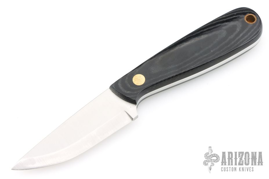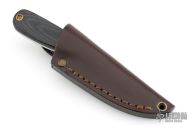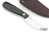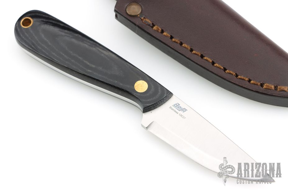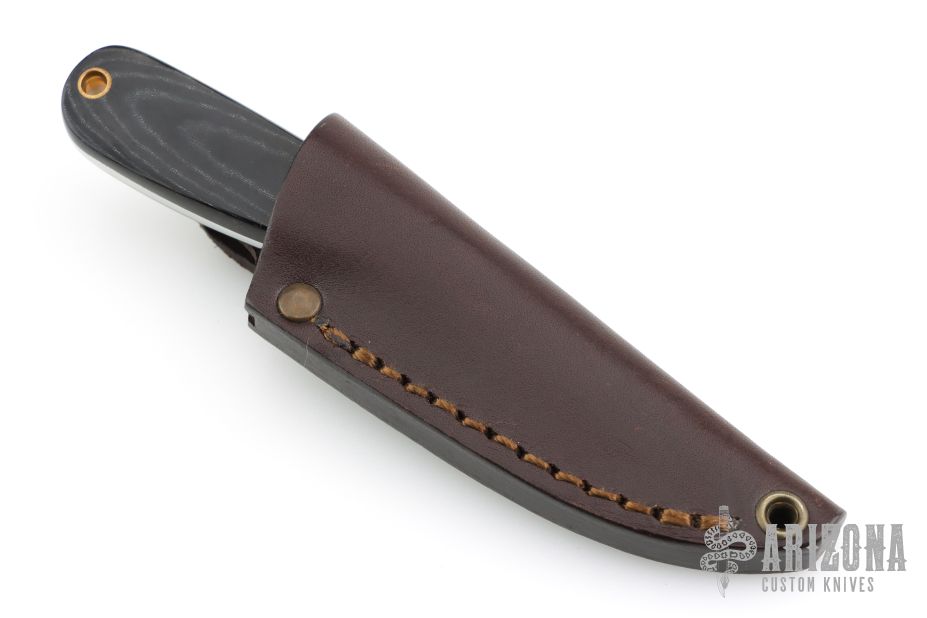 The this Skinner by Brisa features a satin finished scandi ground blade with .134" blade stock and .868" blade depth, full tang construction. The handle has black linen micarta scales with brass pins and lanyard hole. Comes with a brown leather sheath. Has a few light scratches, otherwise excellent condition.