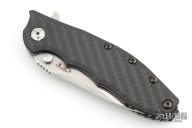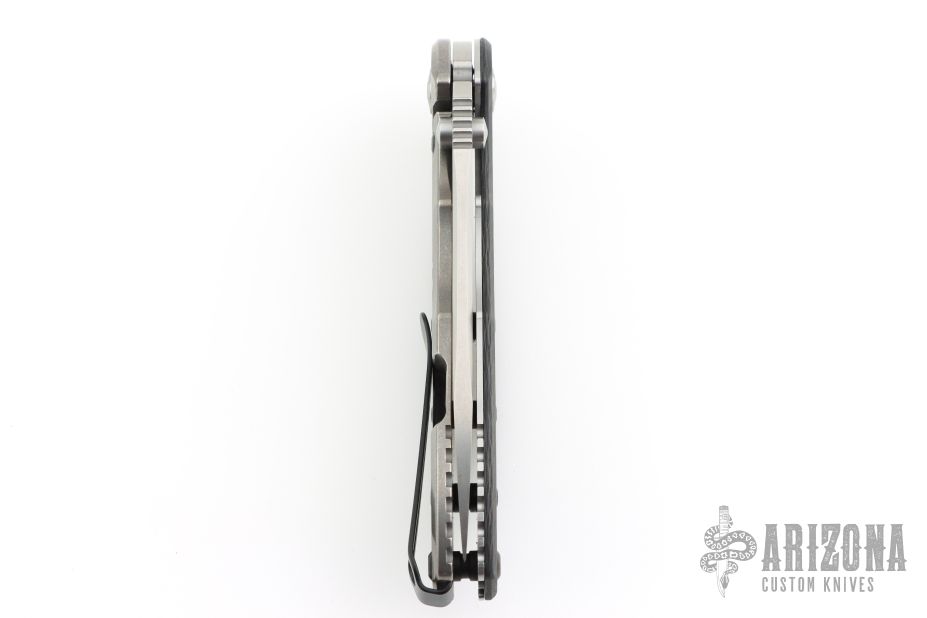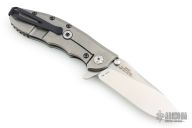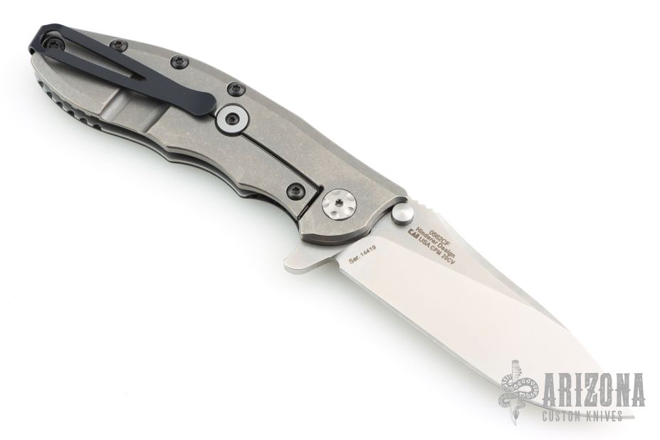 This Hinderer Designed 0562 Framelock Flipper has a drop/ spear point blade with swedge, notched thumb rest, dual thumb studs and flipper. Handle is carbon fiber and anodized and stonewashed titanium - with stainless steel lockbar insert and a carbon fiber lockbar stabilizer.  Stainless steel clip is tip up. Comes with original box and papers. Has a couple light scuffs, excellent condition.