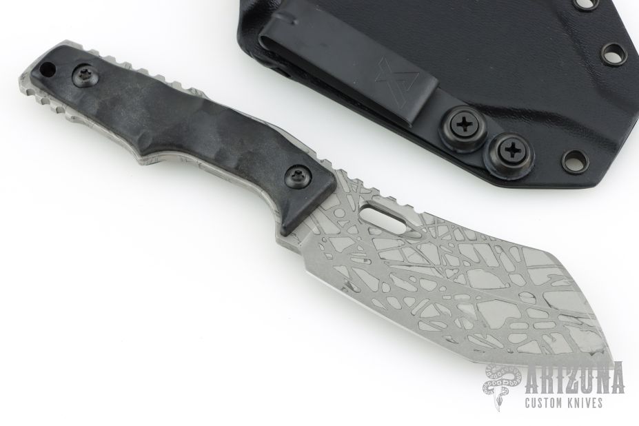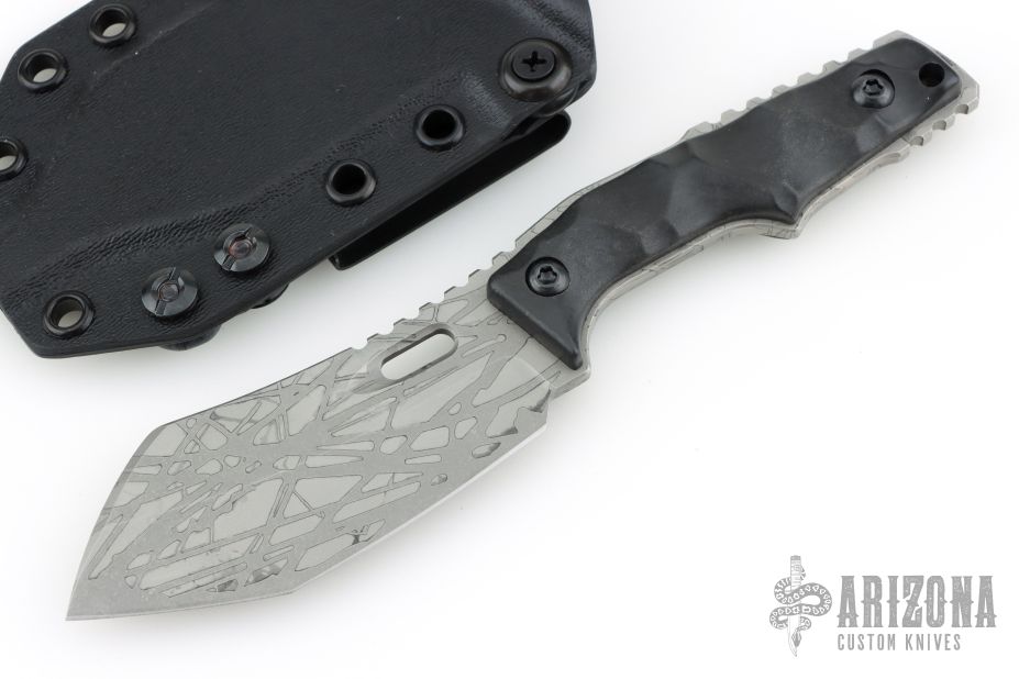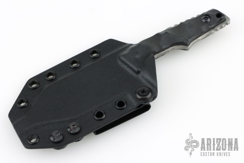 The Overall Goal was to create a sexy but very capable, utilitarian Nessmuk design that is compact but not cumbersome… and at just under 8″ it will disappear on your belt or vest … The other intention was to have a project that allowed us to break from our usual patterning and enjoy experimenting with different finish techniques for both of us. There’s nothing better than being able to hang out with friends, and make really cool things at the same time. For the short run, we chose one of Peter’s favorite steels, and frankly, one that I’m pretty fond of myself…. Carpenter CTS-XHP. We both are Loving this design, and we’re confident you will too. Every knife in this small run is touched by both of us through the various processes… so each knife is a true custom collaborative art piece by both Peter and Ben… from design to reality. They each come with their own Kydex scabbard that is snappy, and the tension is adjustable for the draw. The scabbard clips to a belt or webbing.