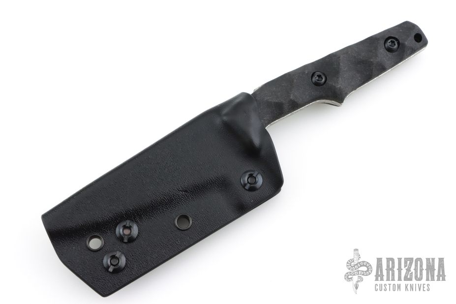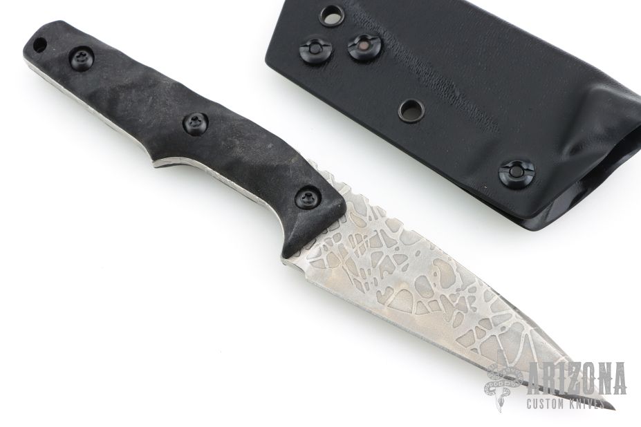 This Thick Huginn EDC by Bawidamann Blades was named after Odin’s Raven. It features an acid etch quicksilver finished blade with notched thumbrest, .158" blade stock and 1.200" blade depth, full tang construction. The handle has IM Bawidamann Chunked Pattern Carbon Fiber scales (proprietary Carbon fiber composite). Comes ready to carry with the Bawidamann Uberscabbard. New from maker.