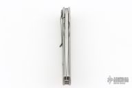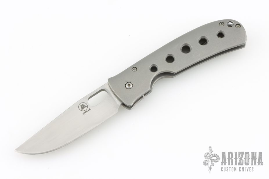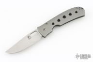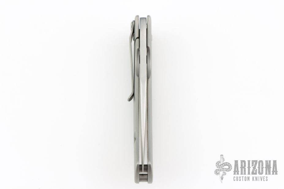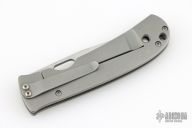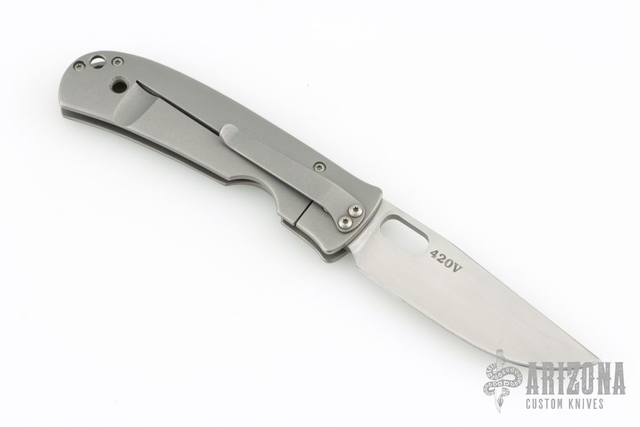 This Medium TNT folder by Tom Mayo features a hand rub satin finished 420V Steel blade with thumbhole. The handle has a bead blasted titanium frame with titanium tip down clip. Smooth action. Nice detent, blade seating and lockup. Has light scuffs, otherwise excellent condition. Comes with a Velcro case.