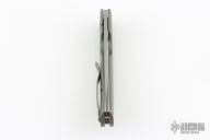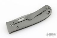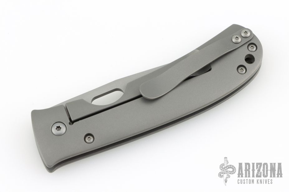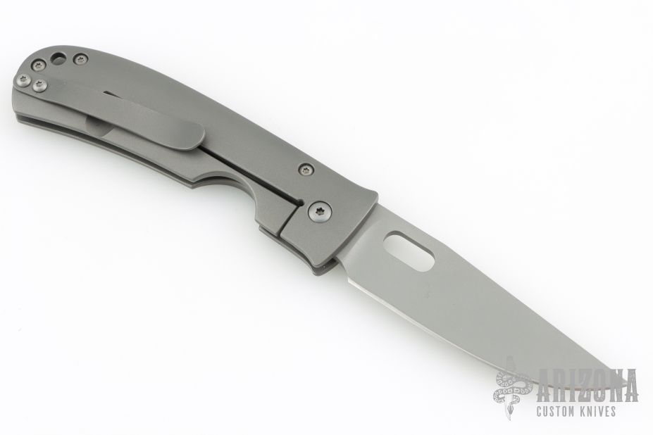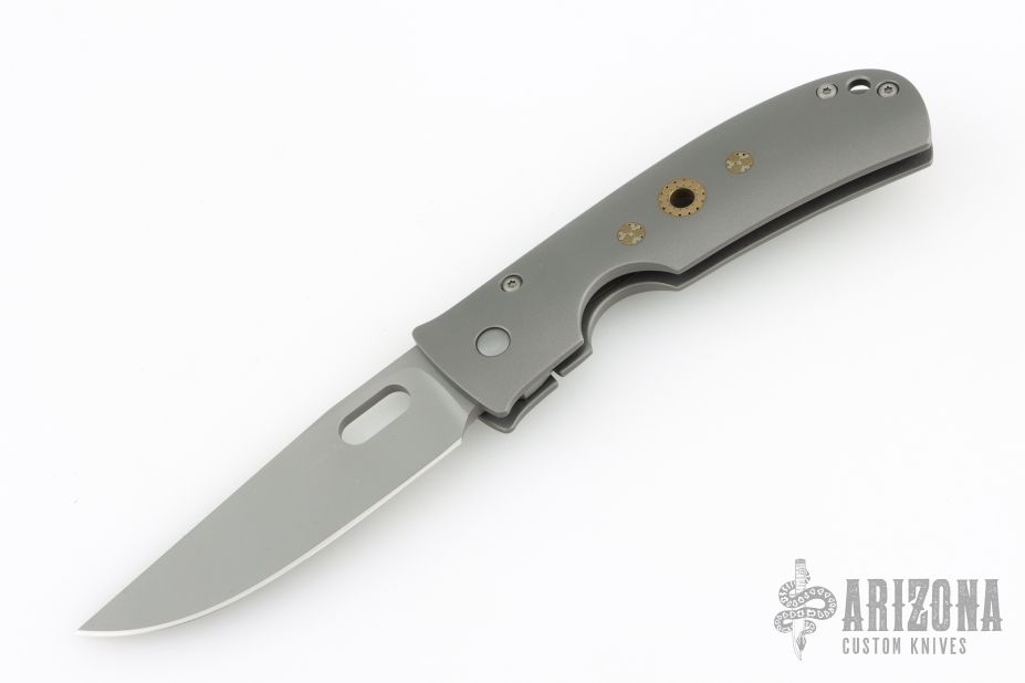 This Medium TNT folder by Tom Mayo features a bead blasted blade with thumbhole. The handle has a bead blasted titanium frame with mosaic pin accents, titanium tip up clip. All titanium hardware, knife is completely non-magnetic. Smooth action. Nice detent, blade seating and lockup. Excellent condition. Comes with a Velcro case.