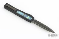 This Custom NYX by Heretic Knives features a Bakers Forge Damascus double edged blade with fullers. The handle has a black aluminum frame with abalone inlays framed in carbon fiber, carbon fiber button with abalone inlay, DLC titanium clip with ceramic ball insert, DLC hardware, ceramic glass breaker at the butt. Comes with original box, zippered case and COA #2 of 30 and dated 03/2025. New condition.