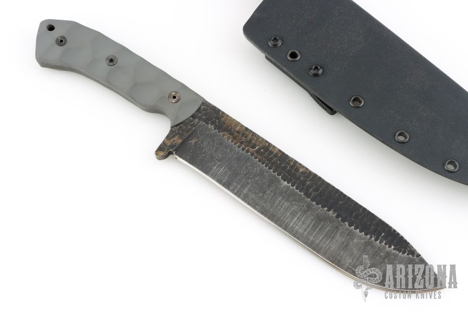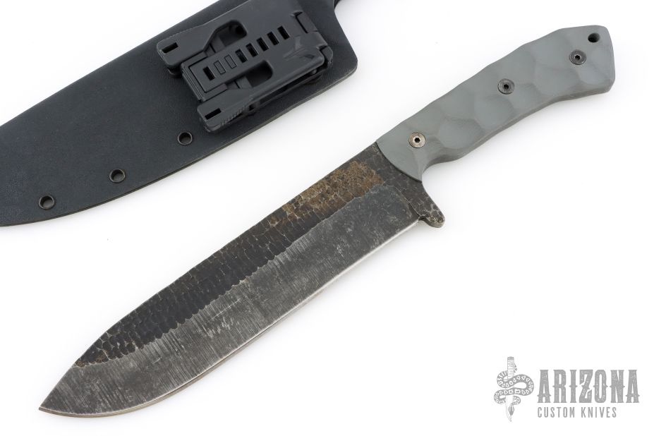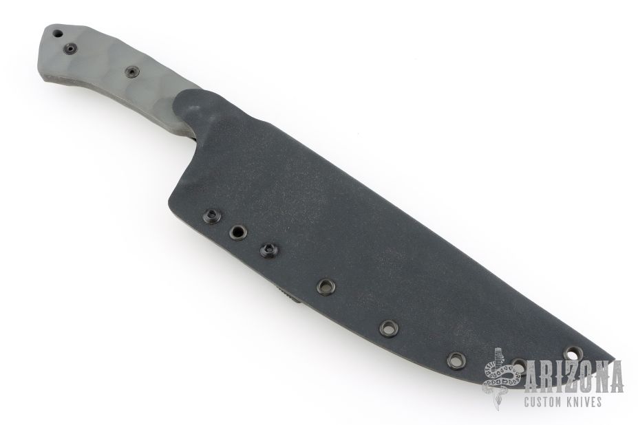 This knife by Stroup Knives features a dark tumbled drop point blade with sculpted flats and a full tang construction.  .266" Blade Stock.  1.860" Blade Depth.  The handle features sculpted grey G-10 scales.  Includes a kydex sheath with a Tek-Lok.  Includes the original box. Excellent condition.
