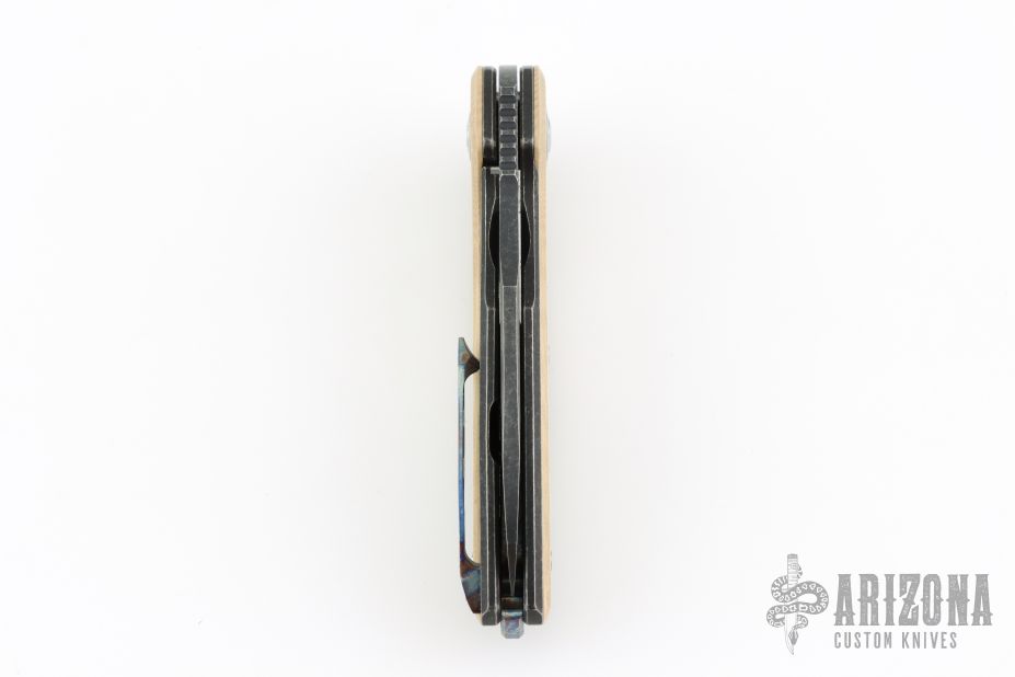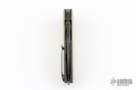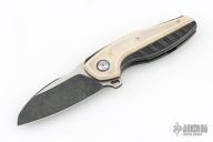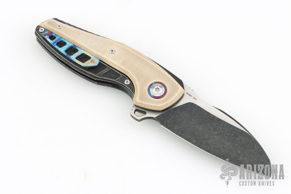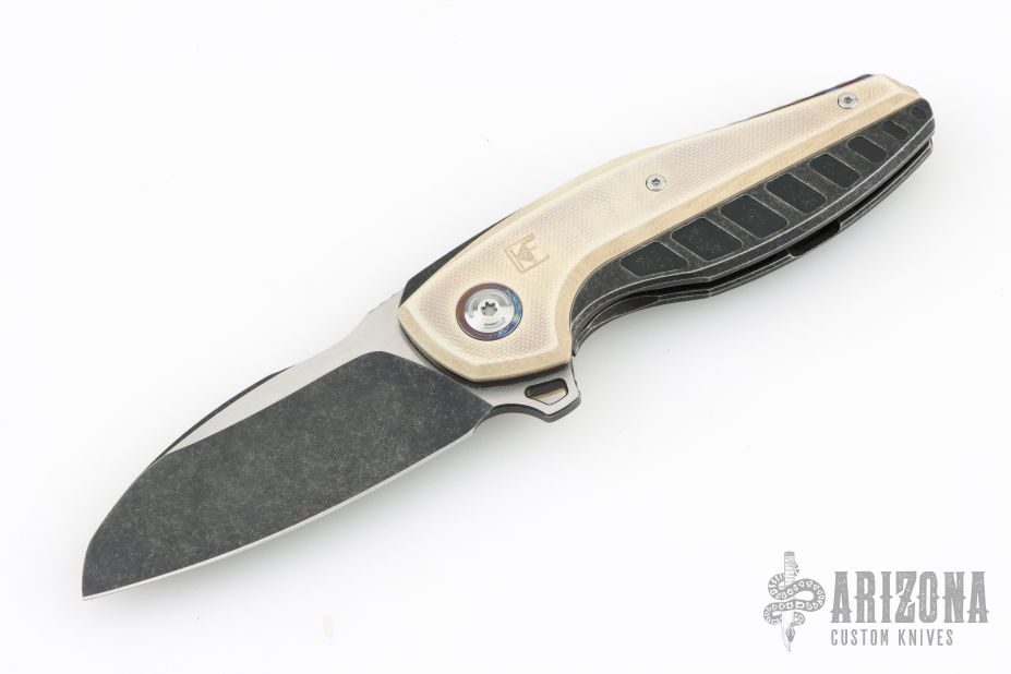The Aich from Custom Knife Factory offers a tough titanium build with a stylish gentlemen's carry design. This model is outfitted with a black stonewashed blade and a black titanium frame with white G-10 scales. The curvy profile rests comfortably in the hand while providing a unique look. It has a modified sheepsfoot blade that provides versatile cutting performance. A low-profile titanium pocket clip finishes off this stunning Anton Malyshev design. Bohler M390 blade steel for excellent hardness with corrosion and wear resistance. A steel reinforced frame lock bar with a replaceable steel insert provides secure blade lock up. Multi-row ceramic ball bearing system for silky smooth blade deployment. #127. Excellent condition.