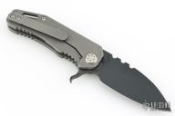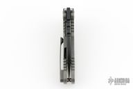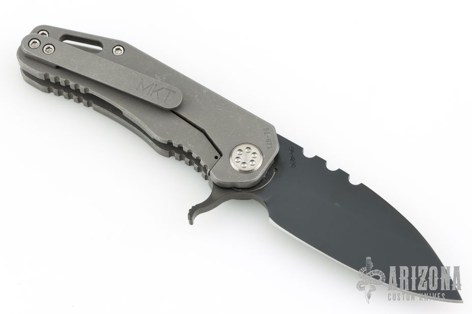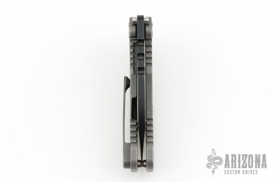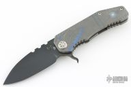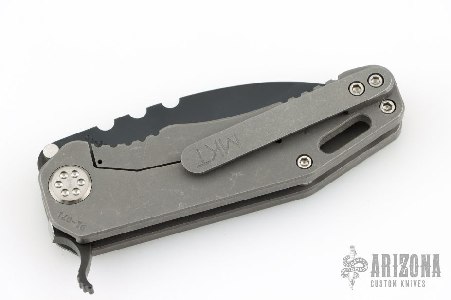This 187F by Medford Knife and Tool features a black PVD finished drop point blade with notched thumbrest and flipper. The handle has a tumbled titanium frame and tip up titanium clip.  Nice detent, lockup and blade seating. Excellent condition.