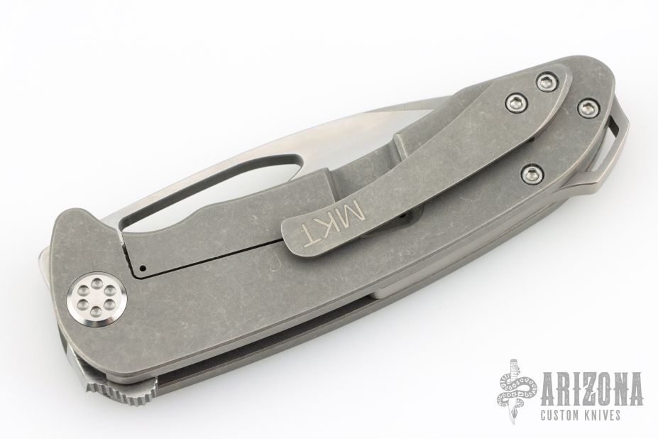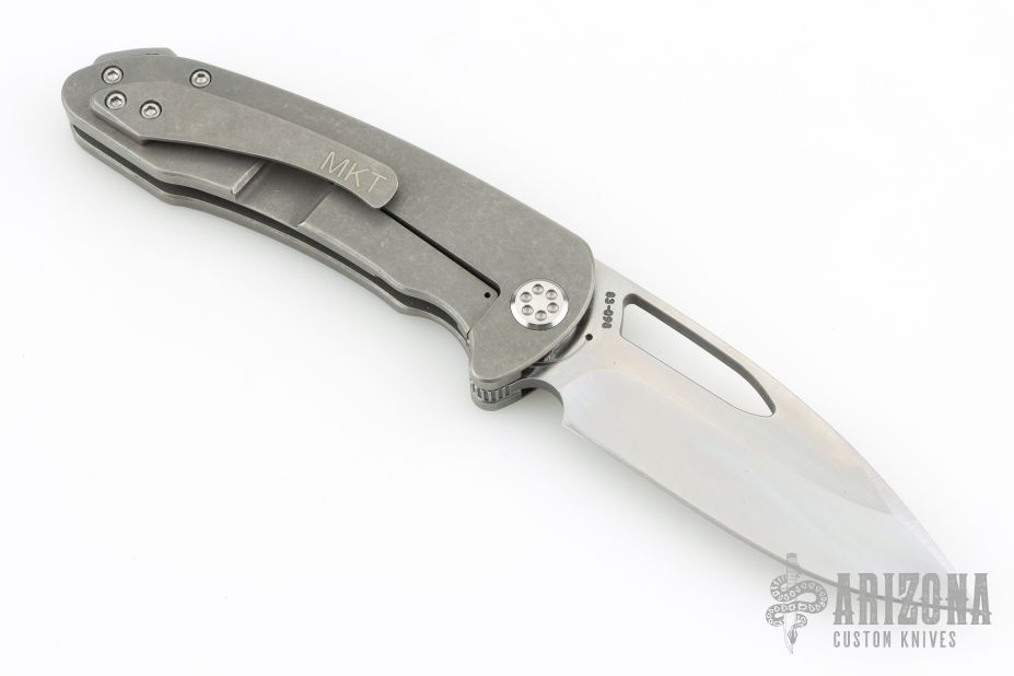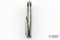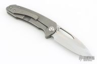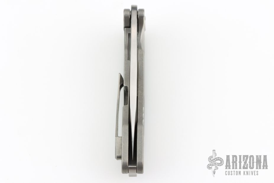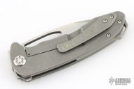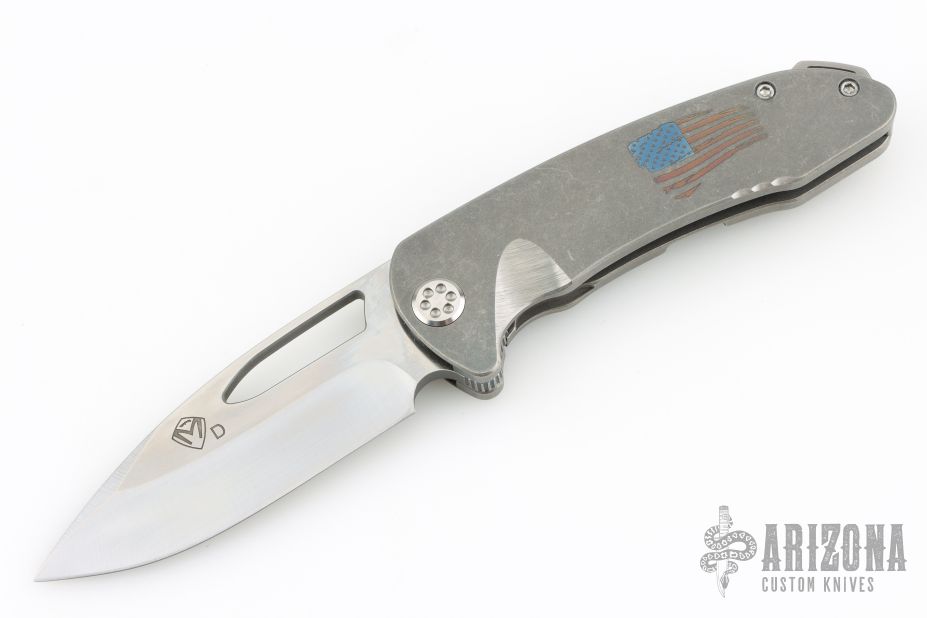 This On Belay by Medford Knives features a satin finished spear point D2 blade with thumbhole. The handle has a tumbled titanium frame with American Flag, stainless steel backspacer with lanyard hole, tip up stonewashed titanium clip. Excellent condition.