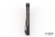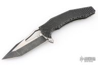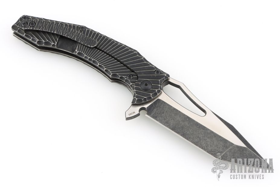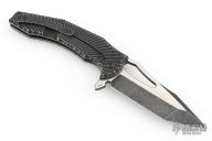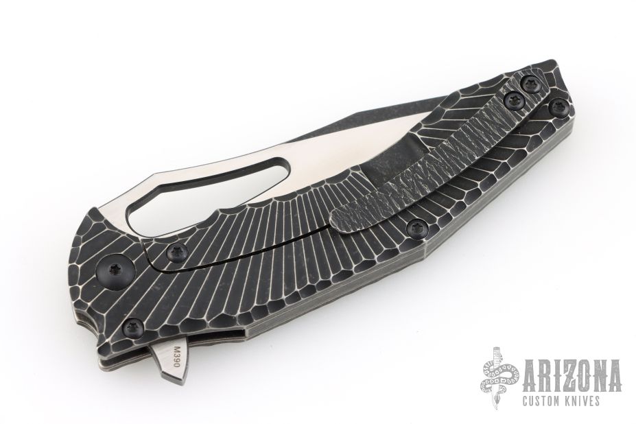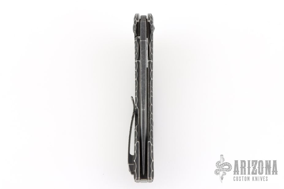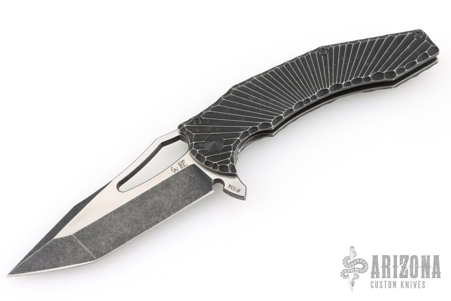 This Spinner from the Custom Knife Factory is a Gavko Design, features a two-tone blade with thumb hole and flipper. The handle has a milled and black tumble finished titanium frame with matching tip up clip and backspacer. S/N #104. Excellent Condition.