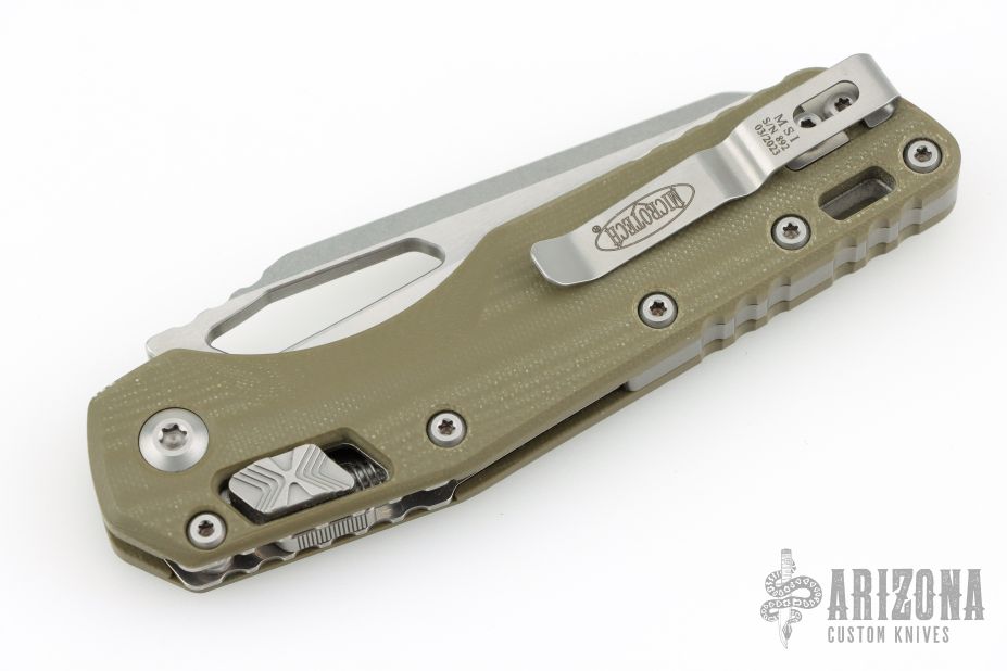 Released in 2023, the MSI (Microtech Standard issue) is Microtech's first knife to feature its fantastic RAM-LOK technology. This tough take on the crossbar lock features Microtech's signature step pattern made famous by the actuation switches on the Ultratech series. The large blade cutout gives ample room for reverse middle finger flicks as well as standard slow-roll thumb opening with or without gloves. If neither of those is your preference, then simply pull down on the RAM-LOK and the blade flies open with a simple wrist flick. The G10 handles are smooth and slightly tacky, providing great grip potential in both standard and reverse grips. Rugged, durable, and made in the USA; we know that the MSI is going to quickly become a fan favorite among all members of the knife community.