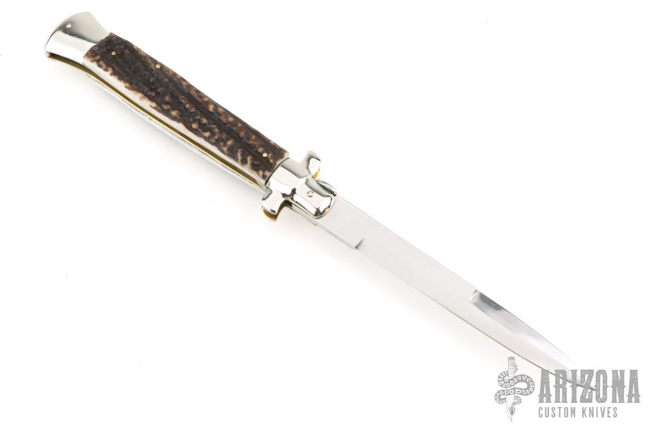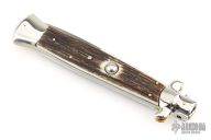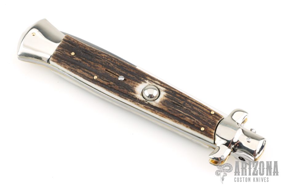Angelo Campolin Sr. was born in 1923 in Maniago, Italy. He worked on perfecting his knife making skills before WWII and at this time made his first switchblades. After the war, in 1947 he started his company and made 30 stilettos with the marking “Angelo Campolin”. In the 1970’s Angelo’s son Gianni started to work in the company and they were specializing in folding hunting knives and also manual folding stilettos for the Robert Klaas company in Solingen Germany with their Kissing Cranes mark. In 2002 American switchblade collectors Dan Fuller, Brad West, and Tim Zinser were visiting Maniago and enjoying a few glasses of wine in a bar with Angelo Jr. and Gianni. The discussion was about a new name for some knife projects they wanted to pursue. It was Brad West that suggested the tang stamp should be AGA, for Angelo, Gianni, Angelo, thus representing three generations in the knife making business. The Campolins liked it and it stuck. In the beginning it was just a few items, but grew to the point where now there are 12 models and different scale options. The goal has been to offer quality switchblades using the old methods and traditions. Being a collector himself, Angelo Jr. knows what others like. The company headquarters has moved to Austria with production still in the original Maniago shop, as well as the others in Maniago that produce the knives for A.G.A. Campolin.