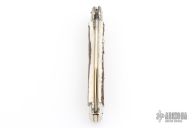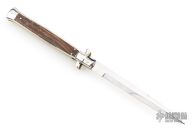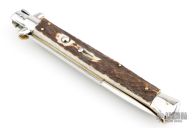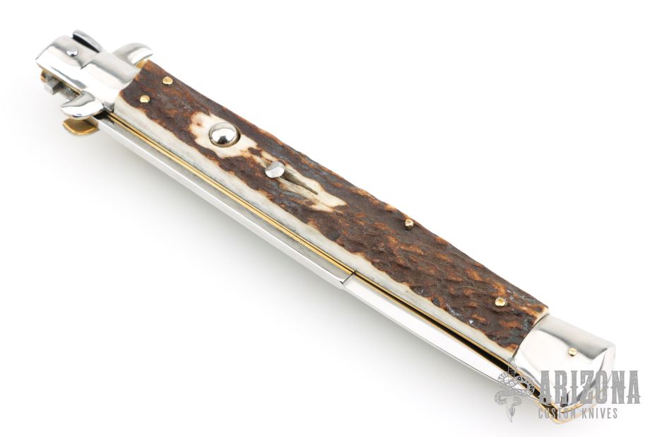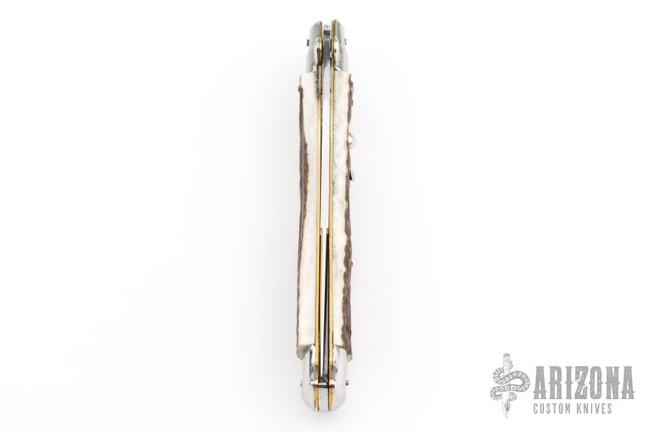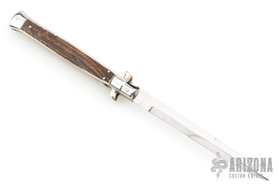 This 13" Swivel Bolster features a polished ground blade with false top edge. The handle has stainless steel bolsters, front and rear, stag scales, brass liners, stainless spring. Comes in a leather slip sheath. Excellent condition. This one was tuned and polished by Greg's Effects and has a COA.