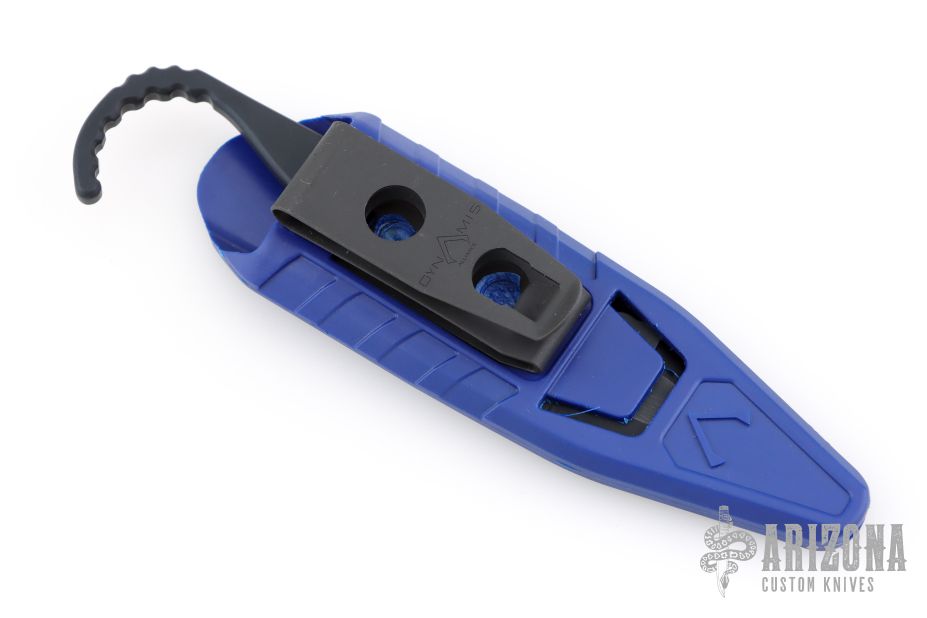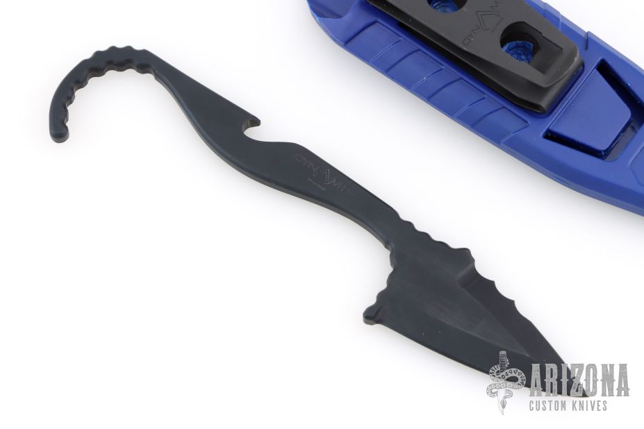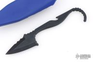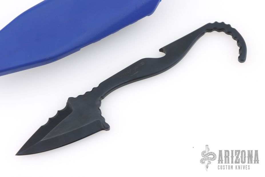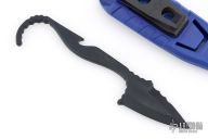 This SMR features a black spear point blade with sharpened and partially serrated top edge, full tang construction,  .164" blade stock and 1.131" blade depth.  Includes a blue plastic sheath. Excellent condition.  Comes with original box and papers. Comes with matching blue alumninum trainer.