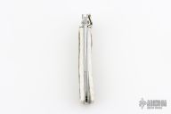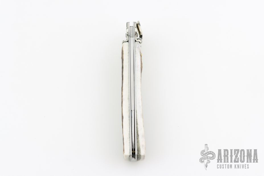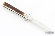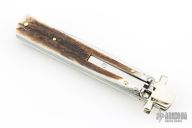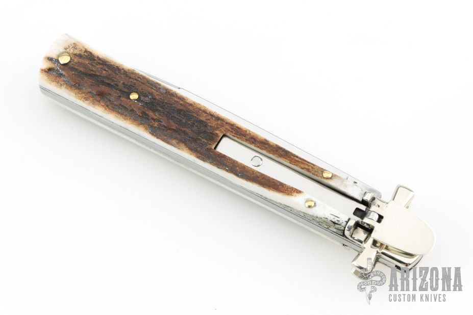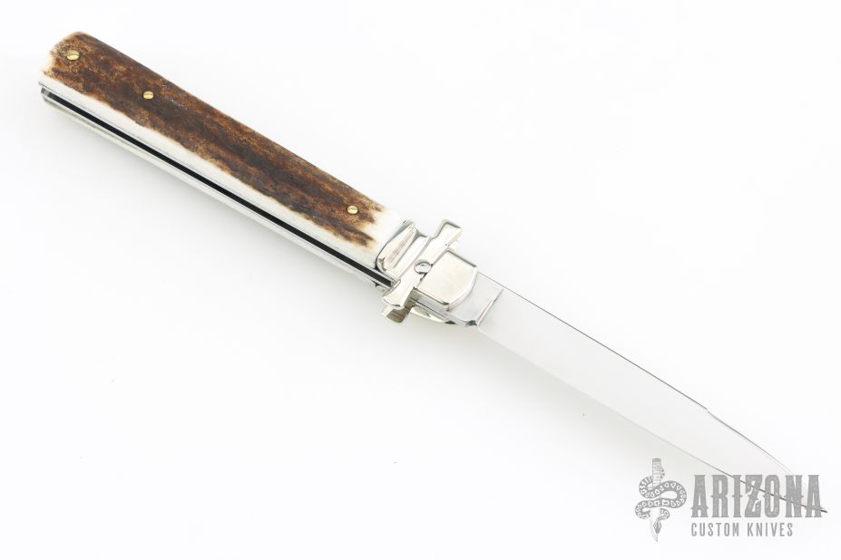 This Leverlock Auto by AGA Campolin has a polished stainless steel spear point blade with false top edge. Handle has stag scales with black liners, nickel silver bolsters, stainless steel liners and backspacer. Comes with original box, and a leather pocket sheath. This one was tuned by Greg's Effects and has a COA.  Excellent condition.