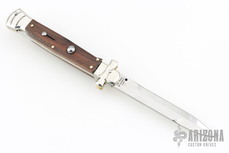 This lockback Auto by AGA Campolin has a stainless steel spear point blade with false top edge. Handle is cocobolo with nickel silver bolsters, brass liners, stainless steel backspacer. Comes with original box and leather slip sheath. This one was tuned and polished by Greg's Effects and has a COA. Excellent condition.